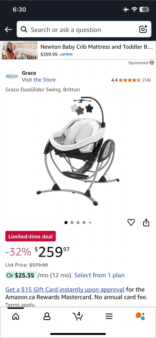 Selling a Graco DuoGlider Gliding Swing ! The swing has 6 gliding speeds, 2-speed vibration, and an option to plug in. Originally listed on Amazon for $379.99 but on sale for $259.97.