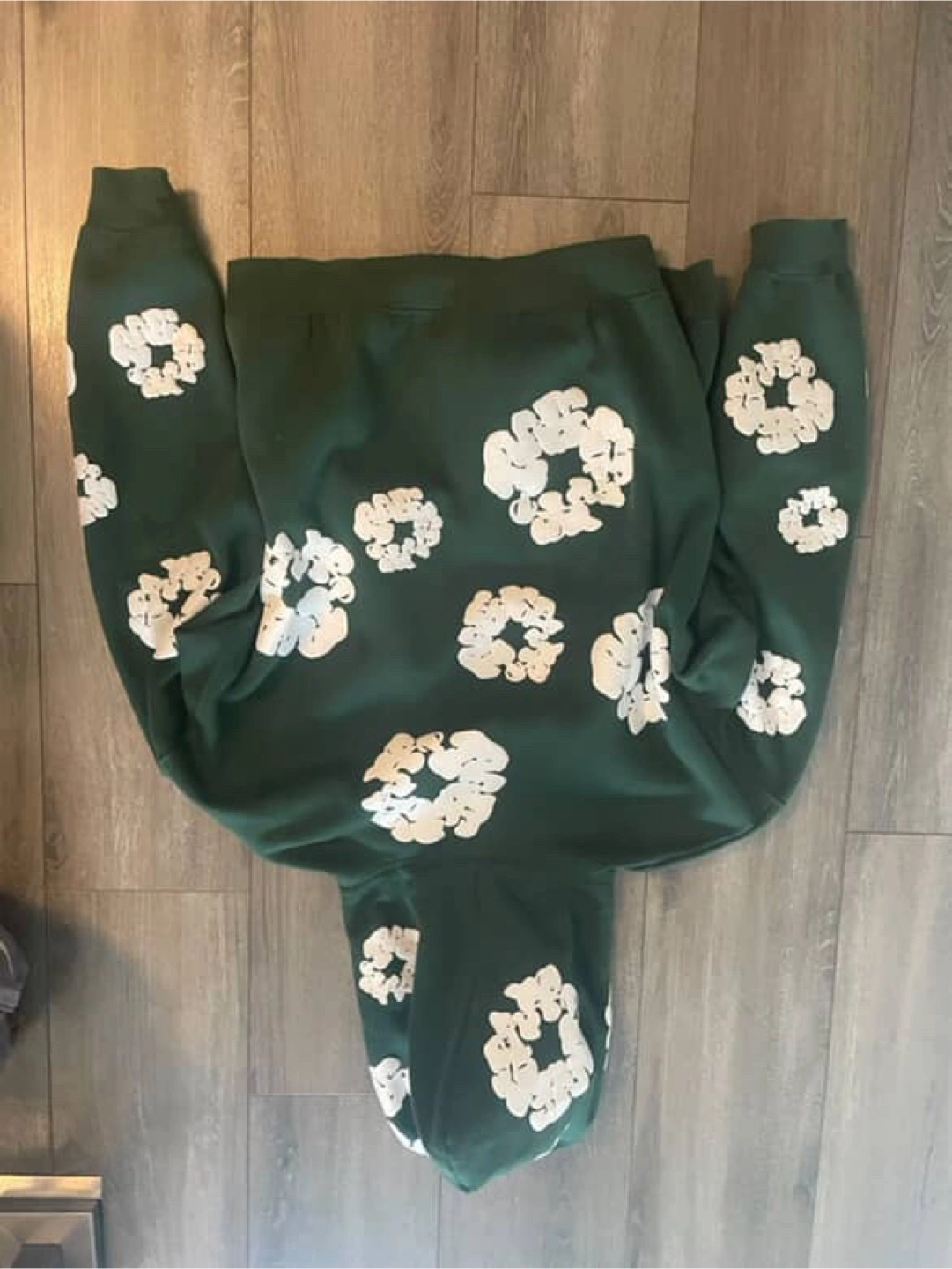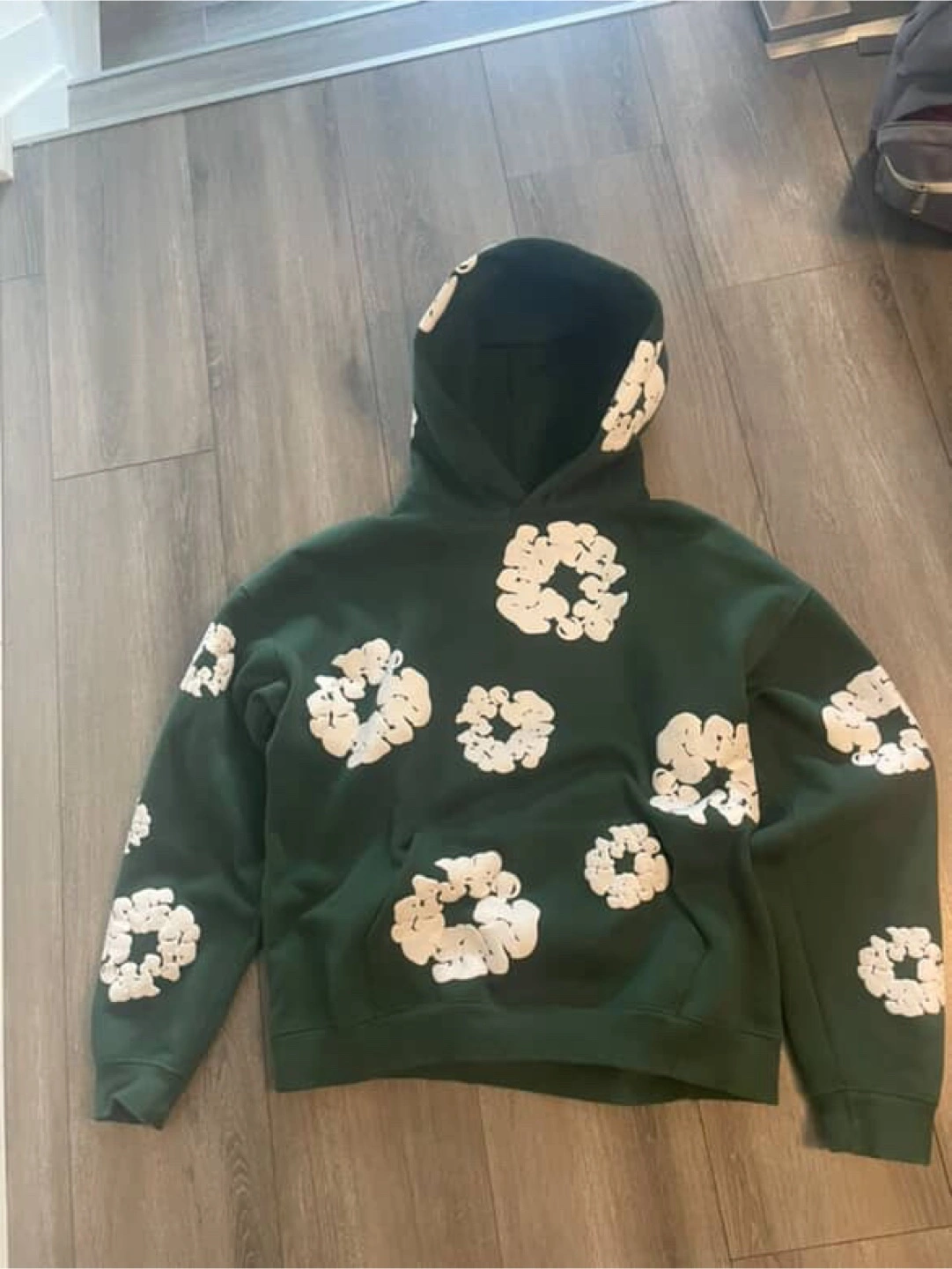Selling a Denim Tears hoodie in a nice green colour. It's a size medium and features a unique floral design. In great condition!