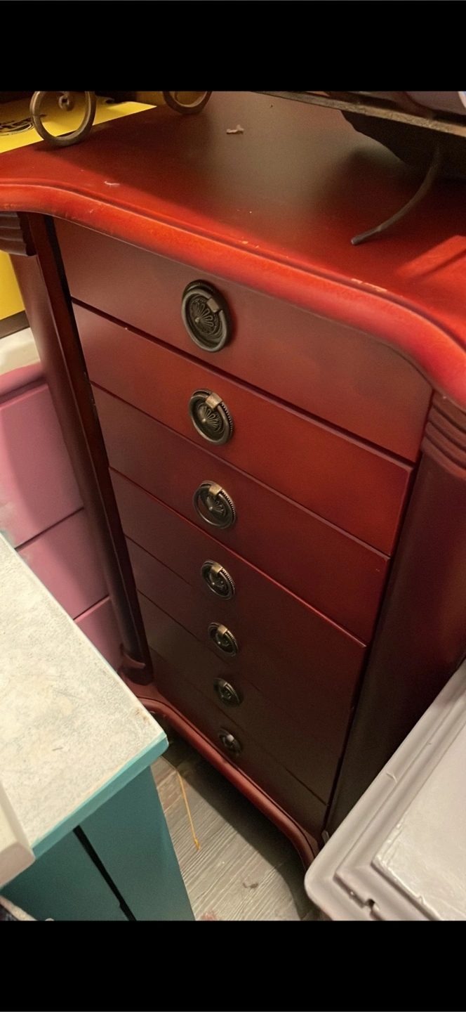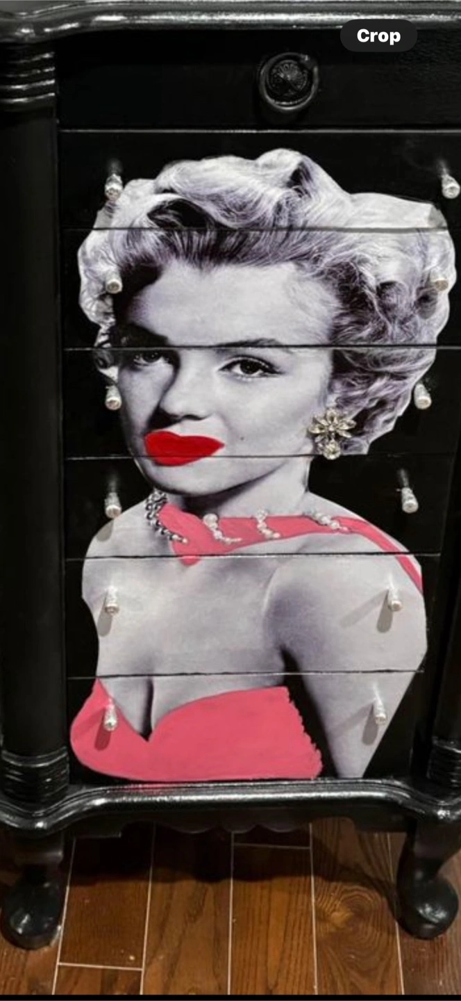 Unique dresser with a Marilyn Monroe design on the 6 drawers .off white velvet interior non smoking home .The dresser is black and features decorative knobs. It's a statement piece that would add a touch of Hollywood glamour to any room