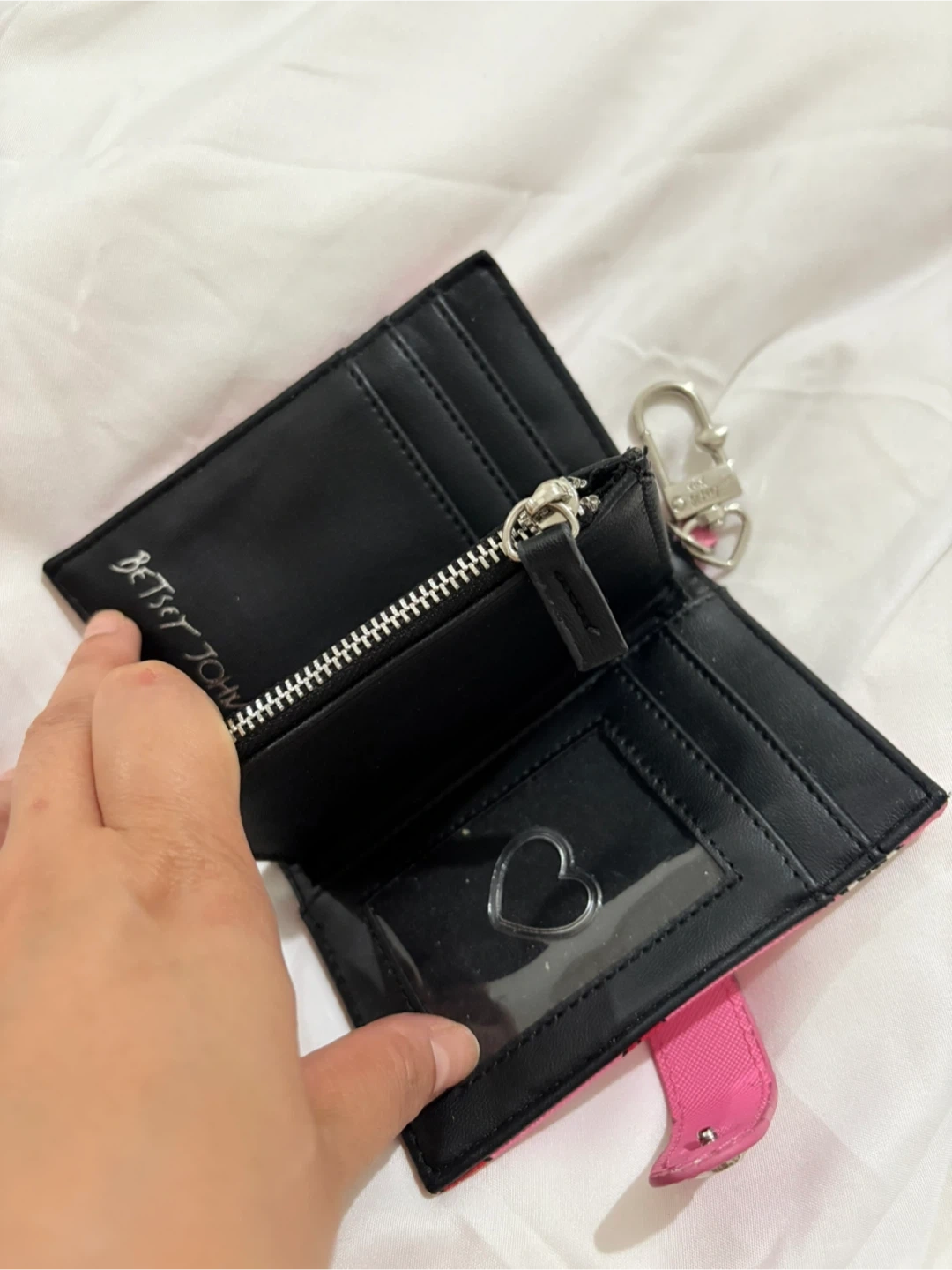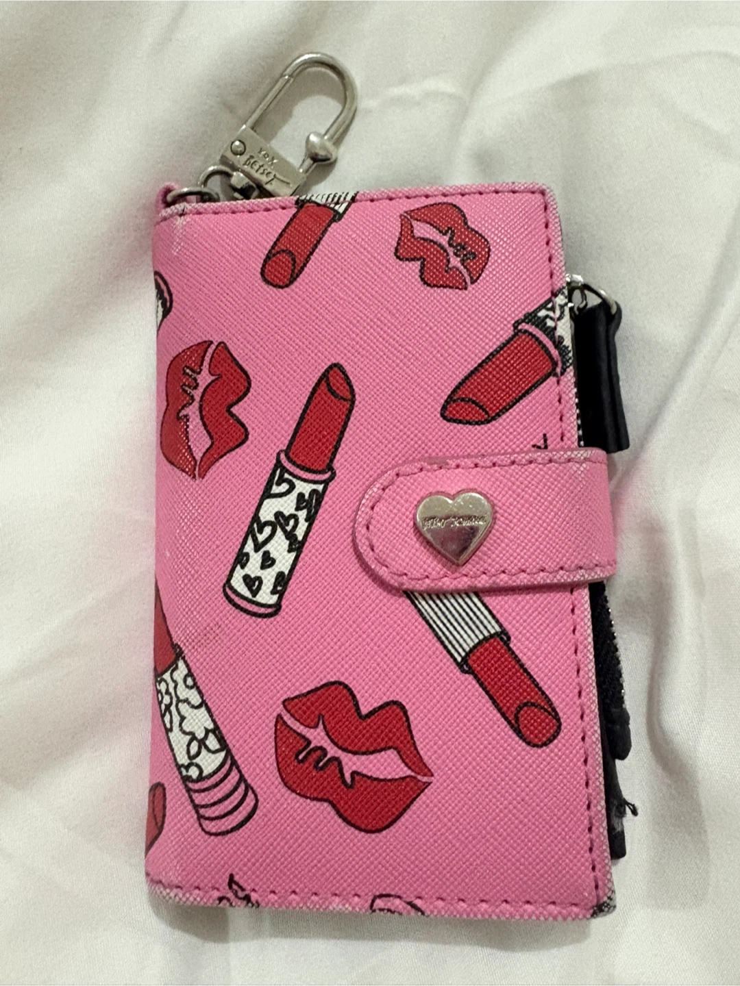 Cute Betsey Johnson wallet in pink with a fun lipstick and lips pattern! It has card slots, a zipper compartment, and a key clip, perfect for keeping your essentials organized