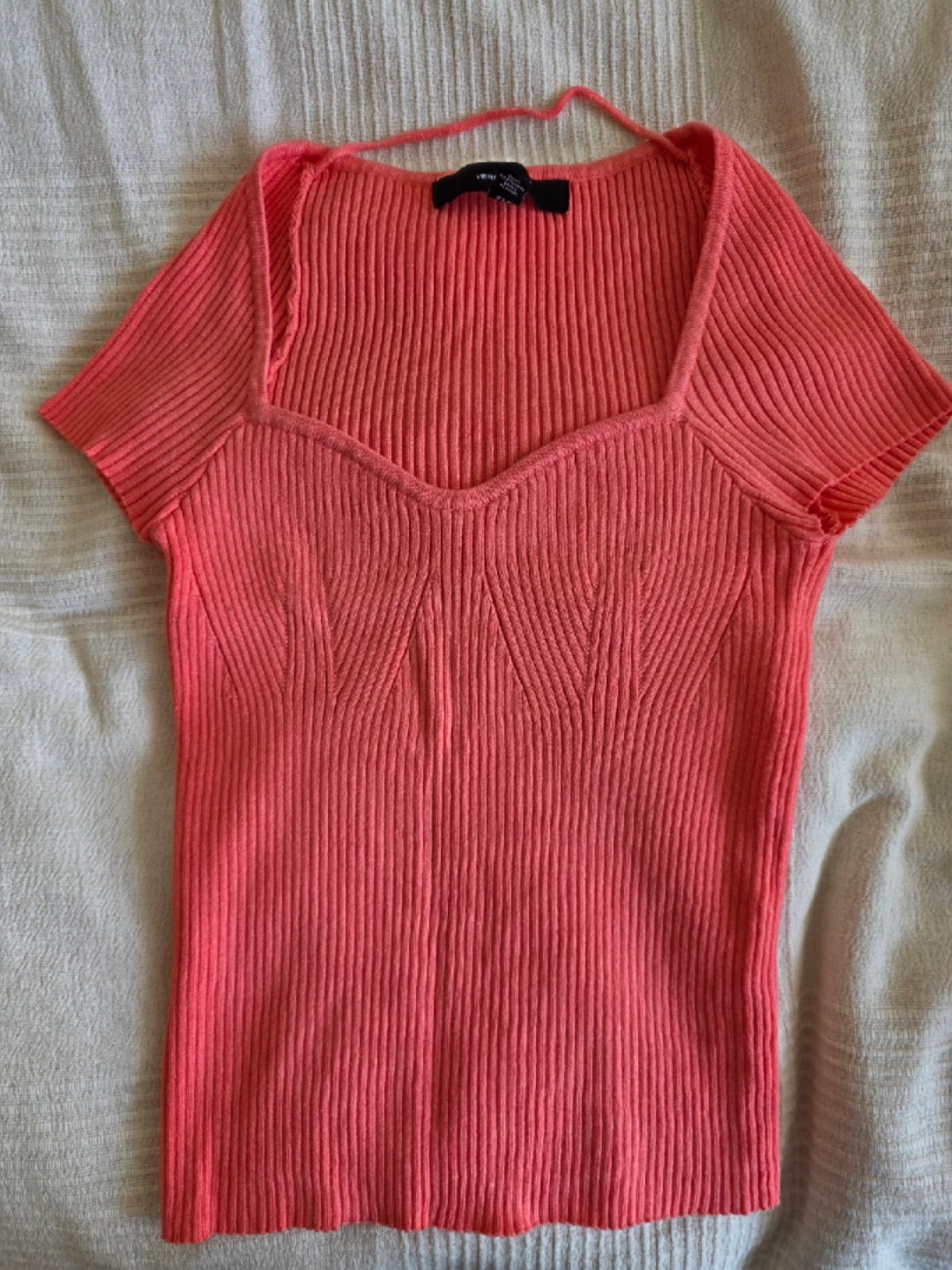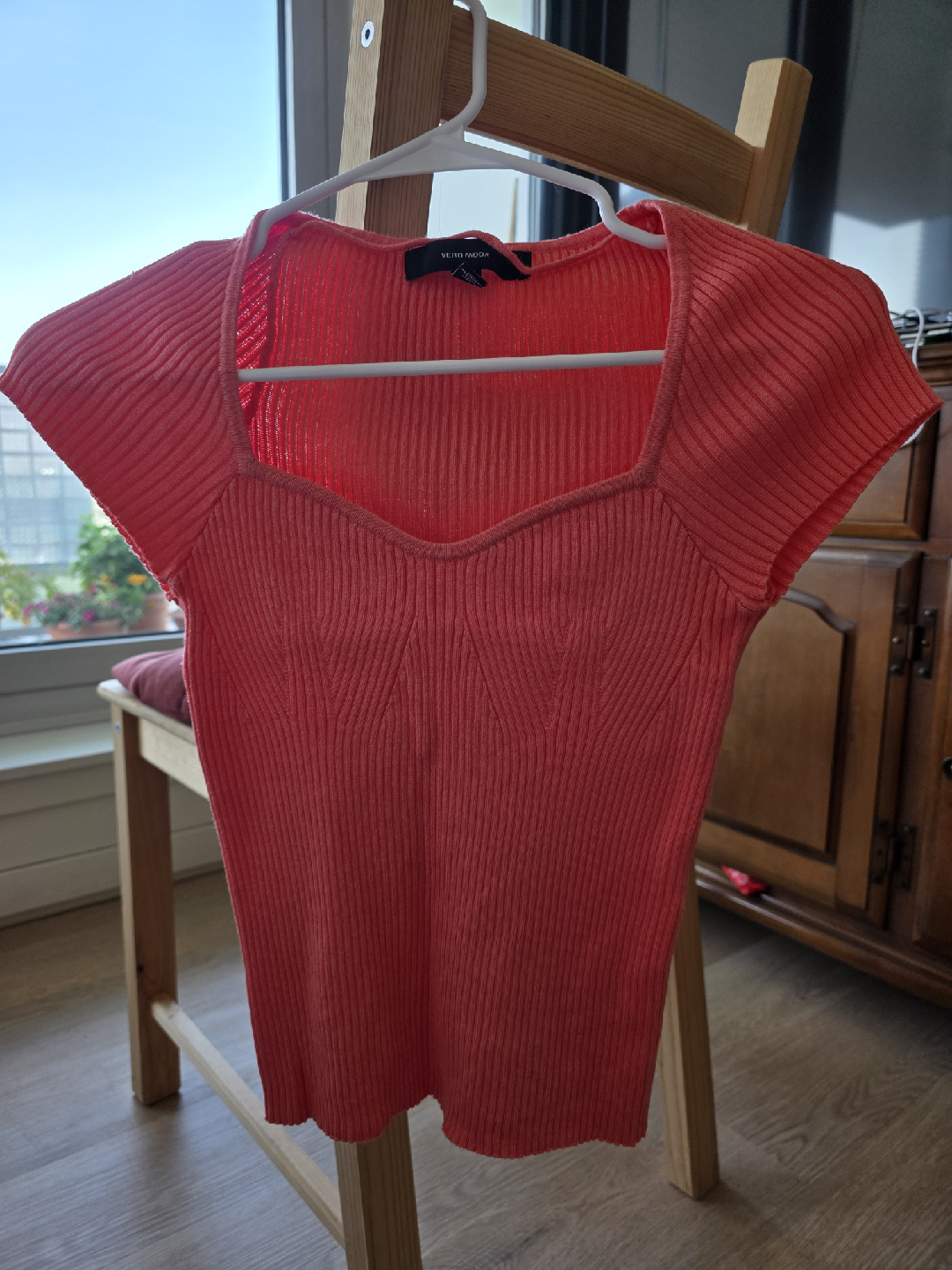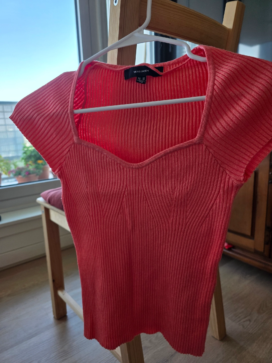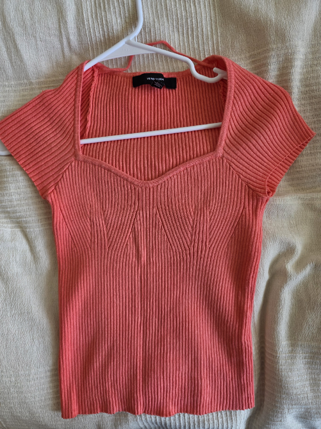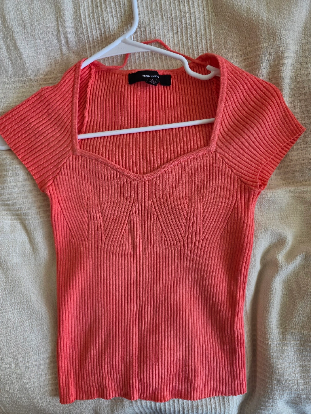 Bright coral ribbed knit top from Vero Moda. Featuring a sweetheart neckline, short sleeves, and a slim fit. Perfect for pairing with jeans, skirts, or shorts for a chic everyday look.