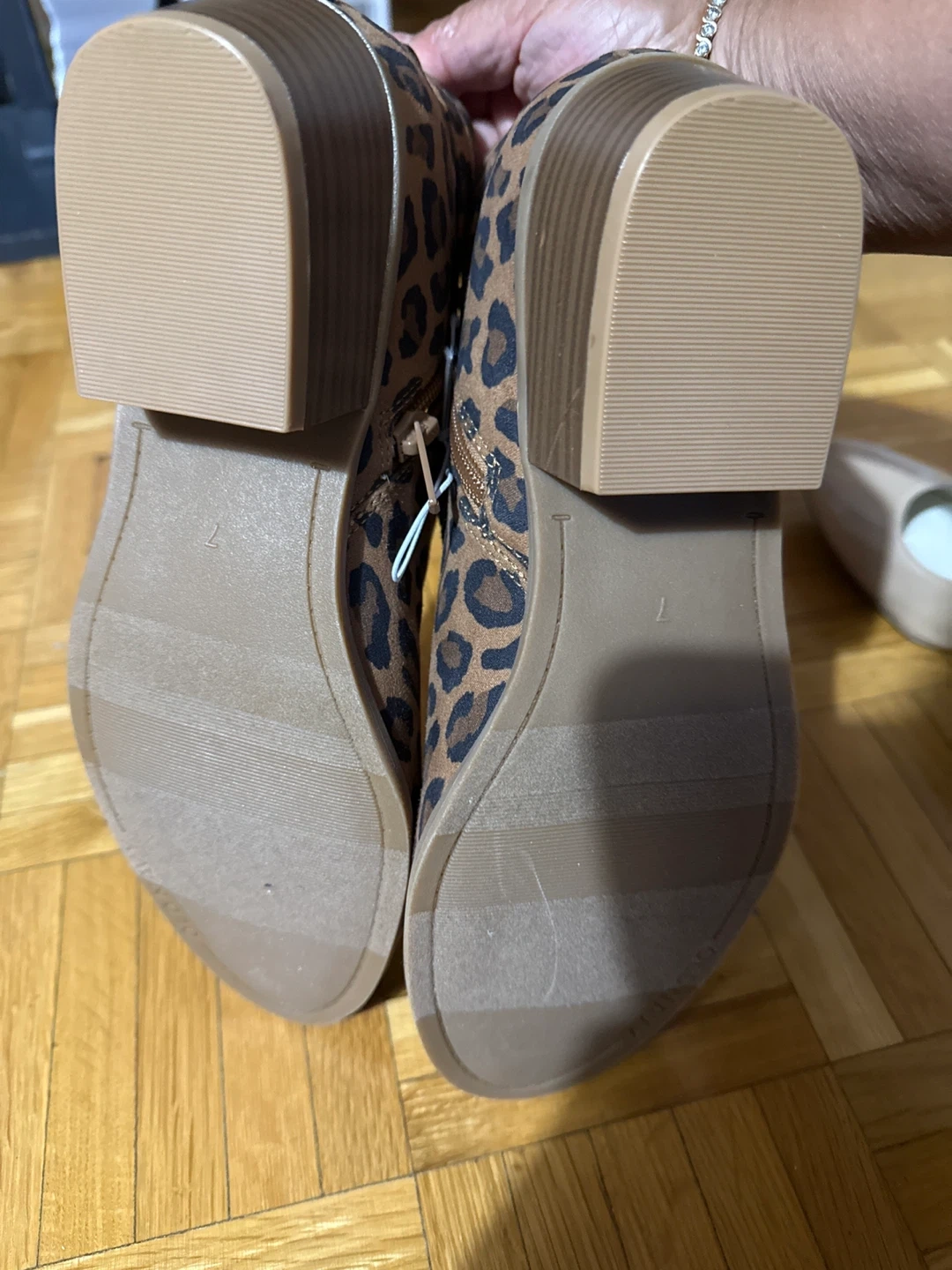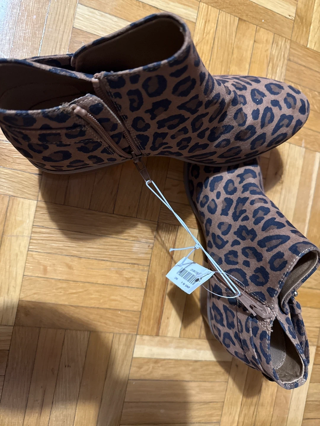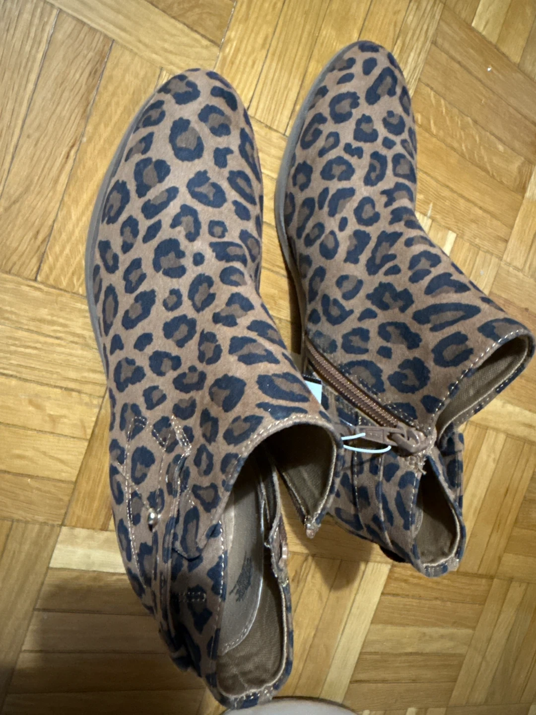 These are brand new ankle boots in a fun leopard print! They're a size 7 and have a comfortable block heel. Perfect for adding a bit of flair to your outfit