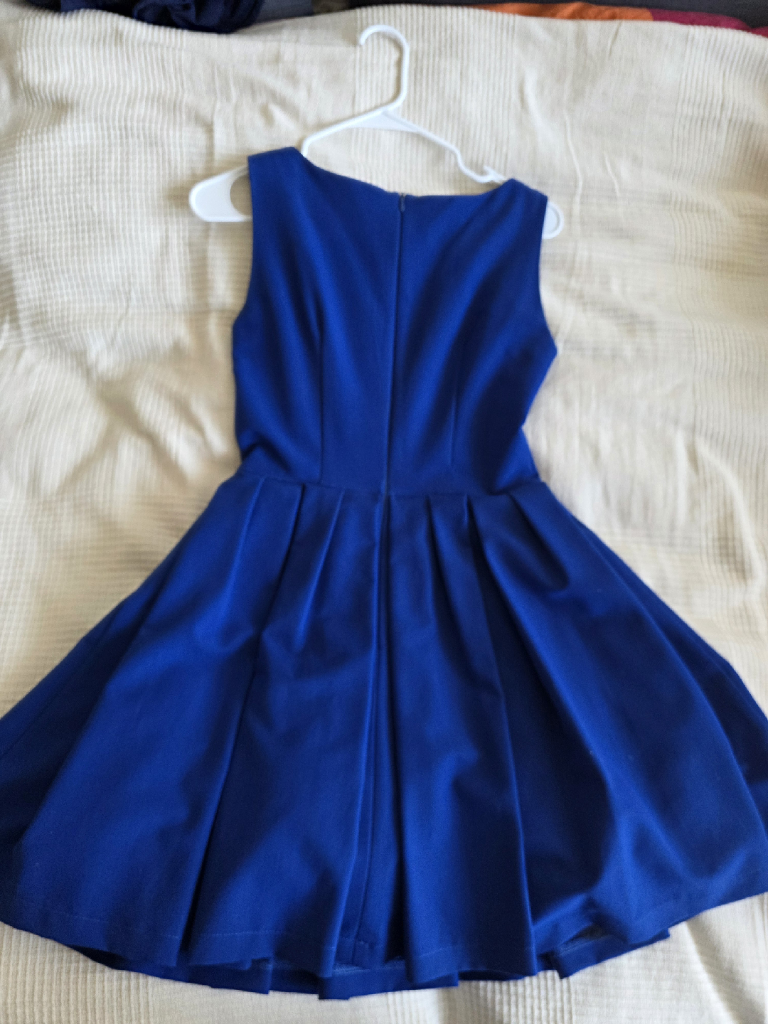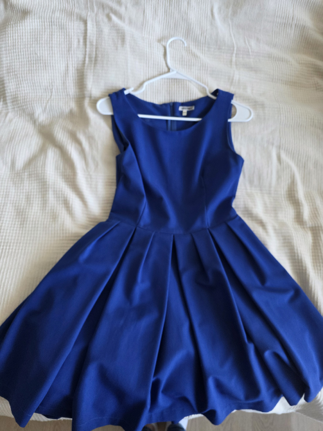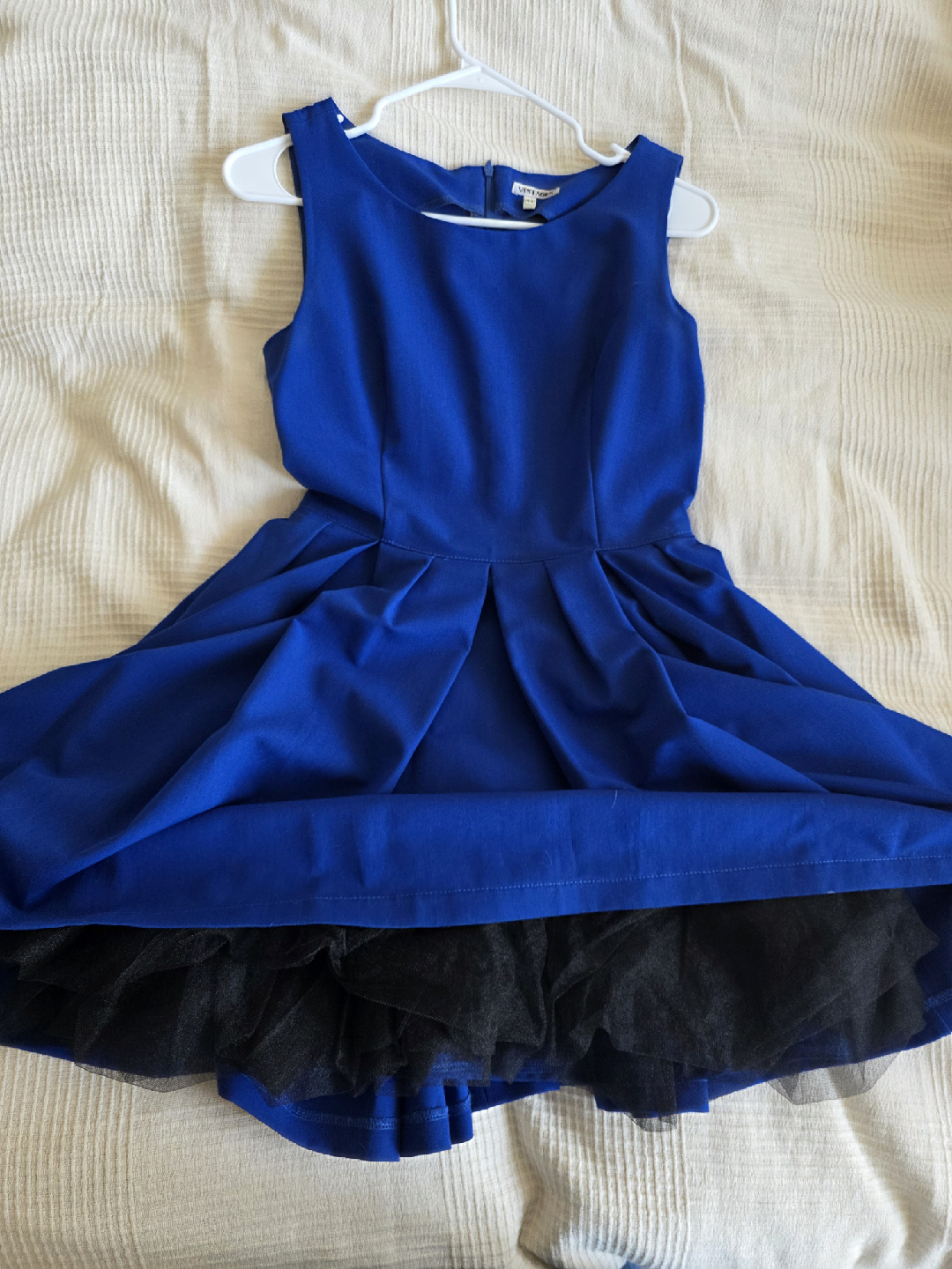 Royal blue sleeveless dress by Vintages. Features a fitted bodice, pleated flared skirt, and black tulle lining for extra volume. Elegant and playful, perfect for parties and special occasions.