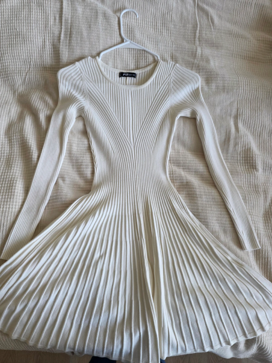 FB Sister ribbed knit dress in off-white. Features long sleeves, a fitted top, and a pleated A-line skirt that creates a flattering silhouette. Stretchy and comfortable, perfect for both casual and dressy occasions. Size XS.
