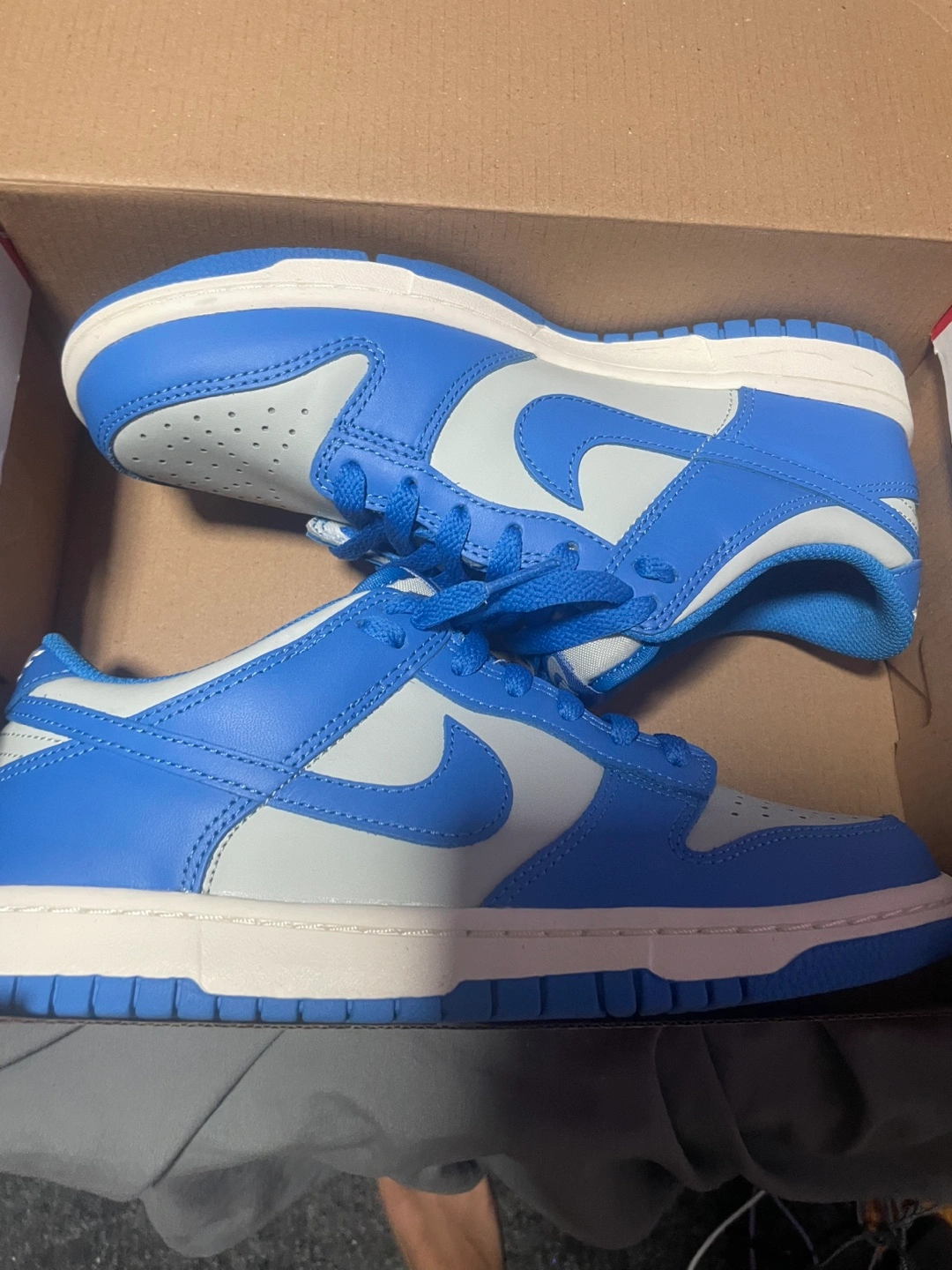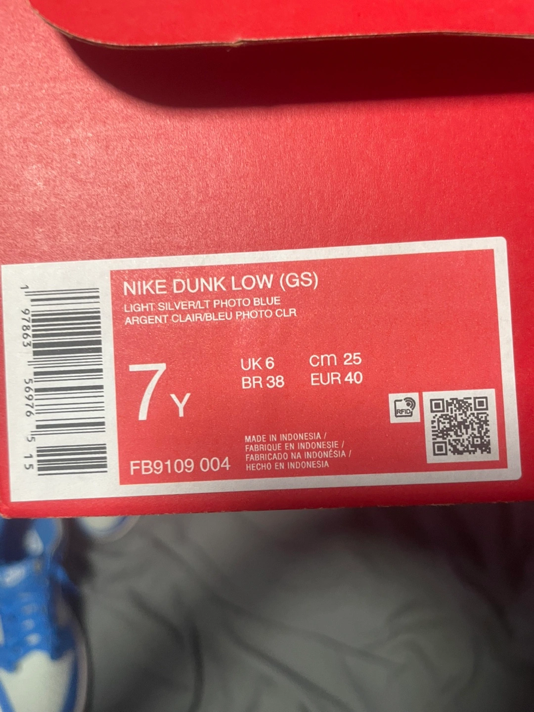 Selling a pair of Nike Dunk Low (GS) sneakers in light silver and photo blue. These are size 7Y and come with the original box. They're in great condition and ready for a new home!