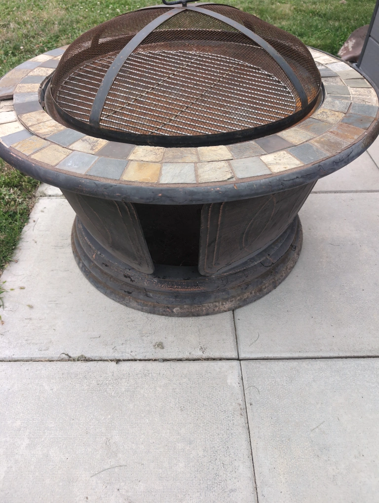 Selling a used fire pit! It features a tile surround that needs some times re attached and a mesh spark screen. Perfect for those cool evenings in the backyard. It does show signs of use, but it's still in good working condition and ready for some marshmallow roasting!