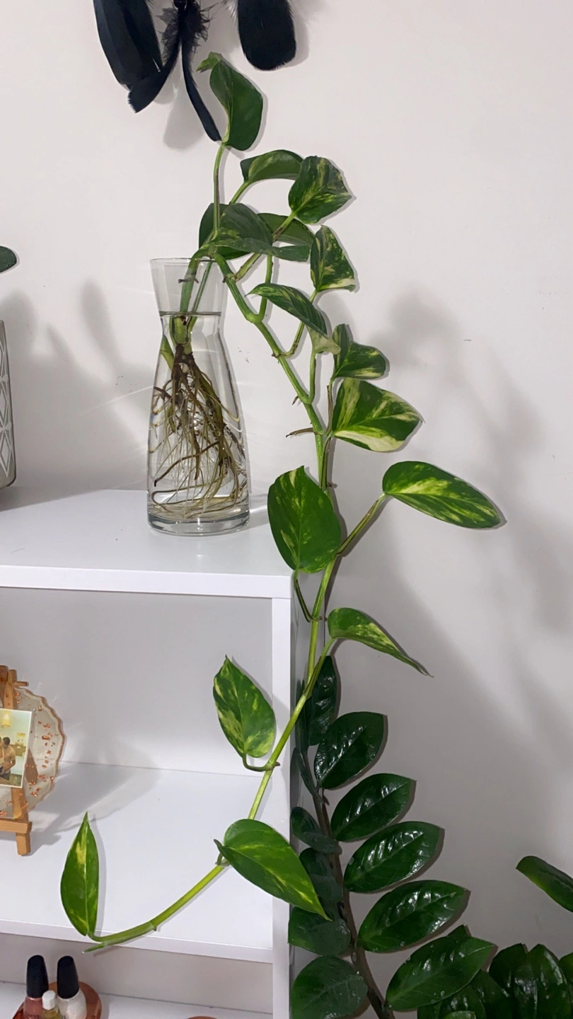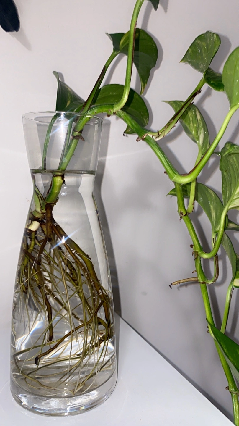 Selling a healthy pothos plant with a clear glass vase! It's a beautiful addition to any home or office space and super easy to care for. The plant has vibrant green and yellow leaves, and the roots are well-established in the water. Give it a new home!
