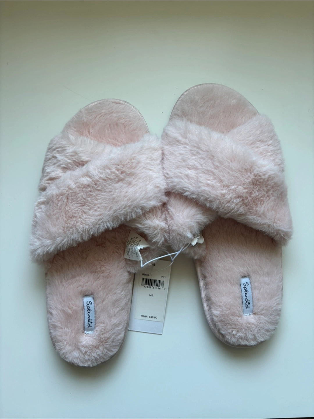 These are a new pair of Splendid women's slippers, size M/L! They're a fuzzy, light pink colour and super comfy-looking. The tag says they retail for $48.00