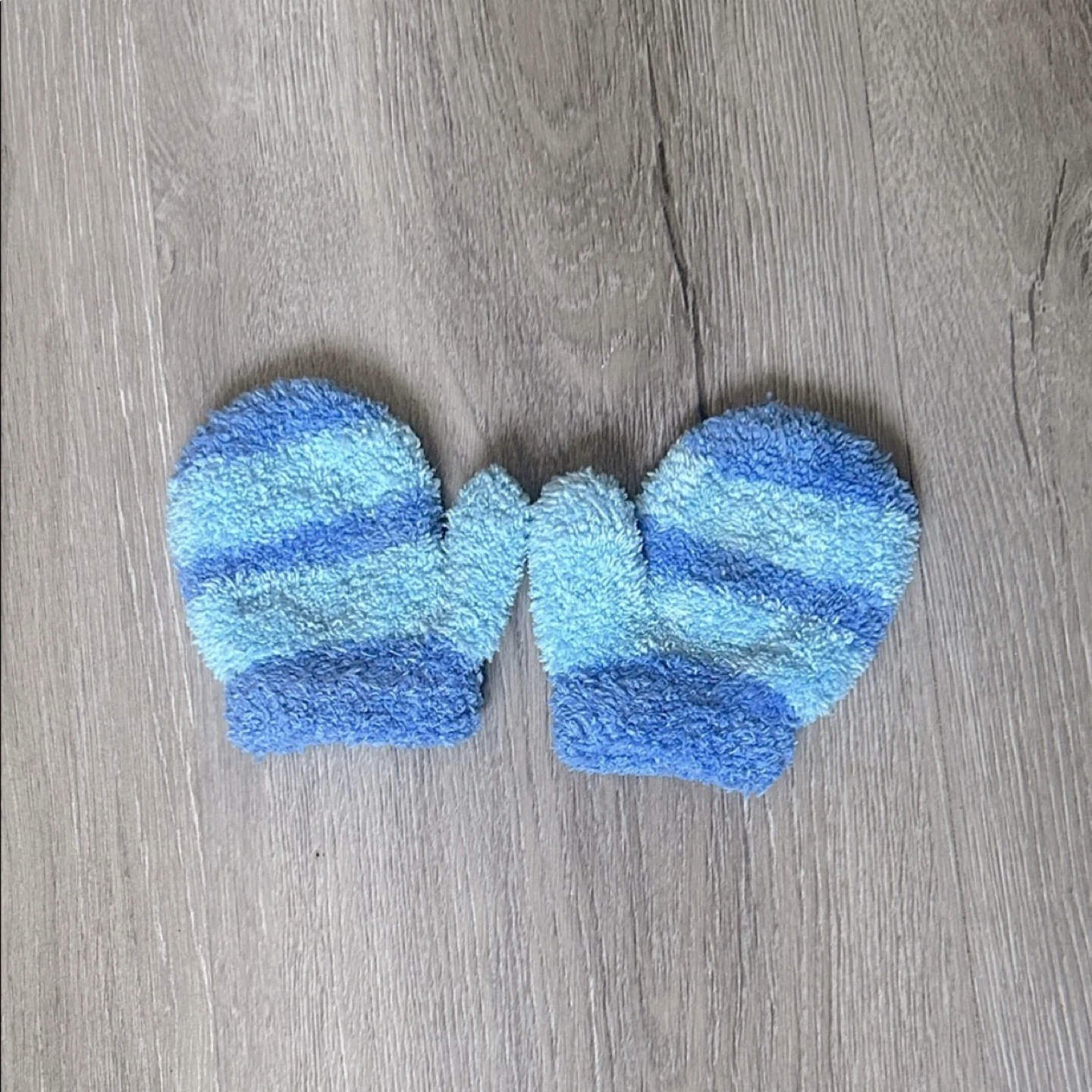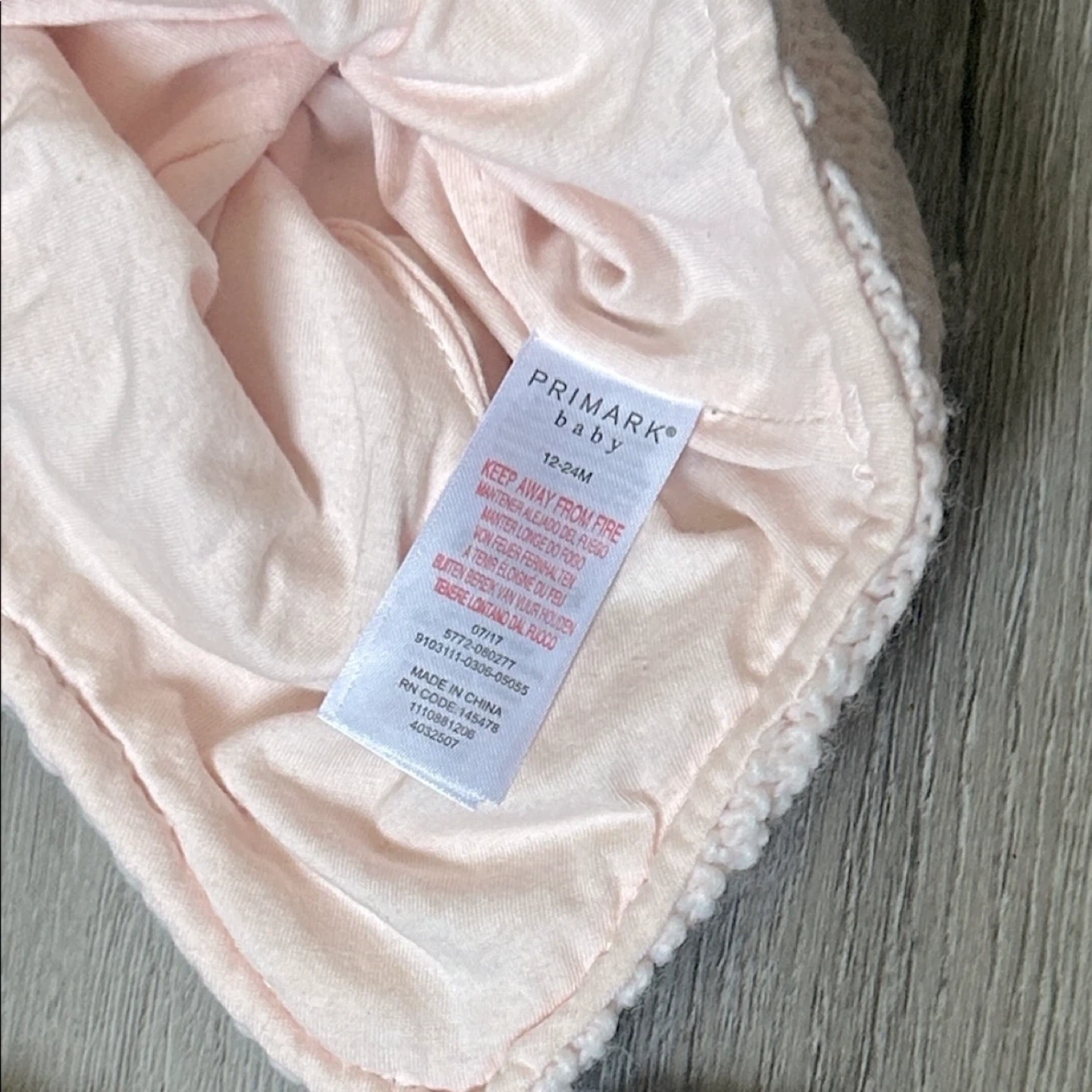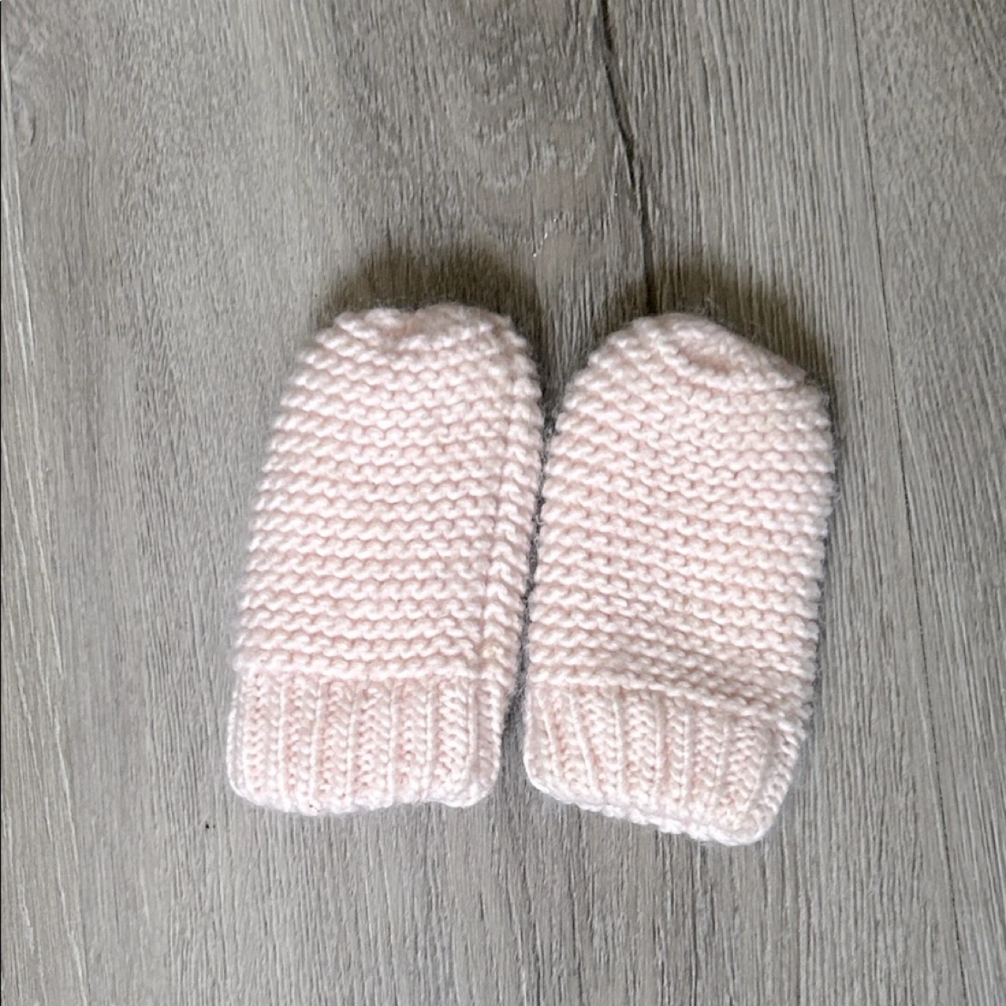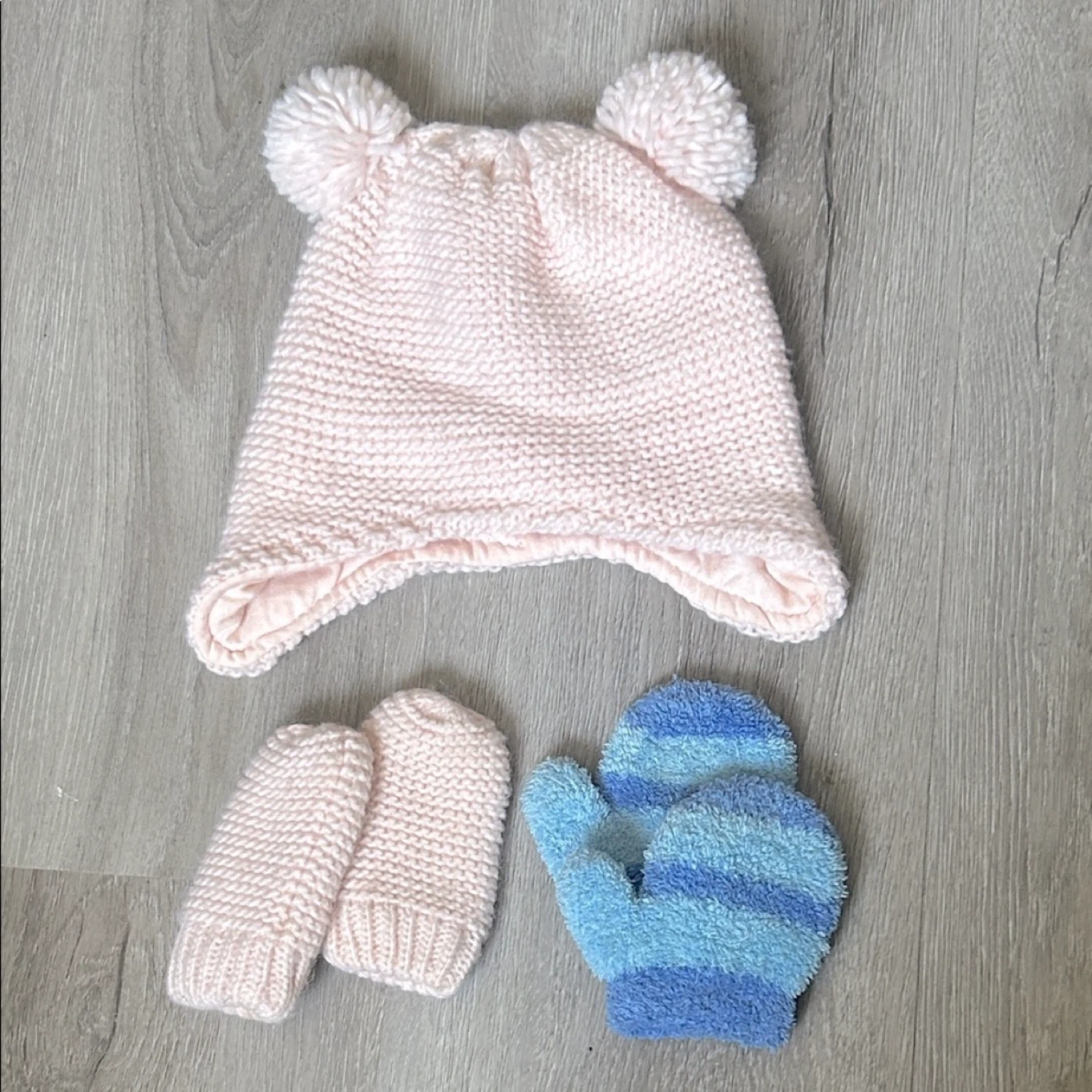 A cute set for your little one! This includes a pink knitted hat with bear ears and two pairs of mittens: one pink knitted pair and one blue striped pair. The hat is sized for 12-24 months.