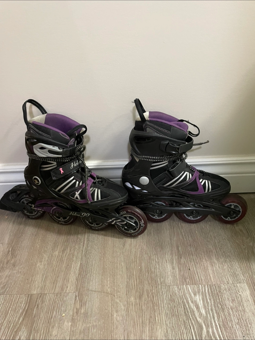 Selling a pair of inline skates in good condition. They're black and purple, and size 7. Perfect for recreational skating!