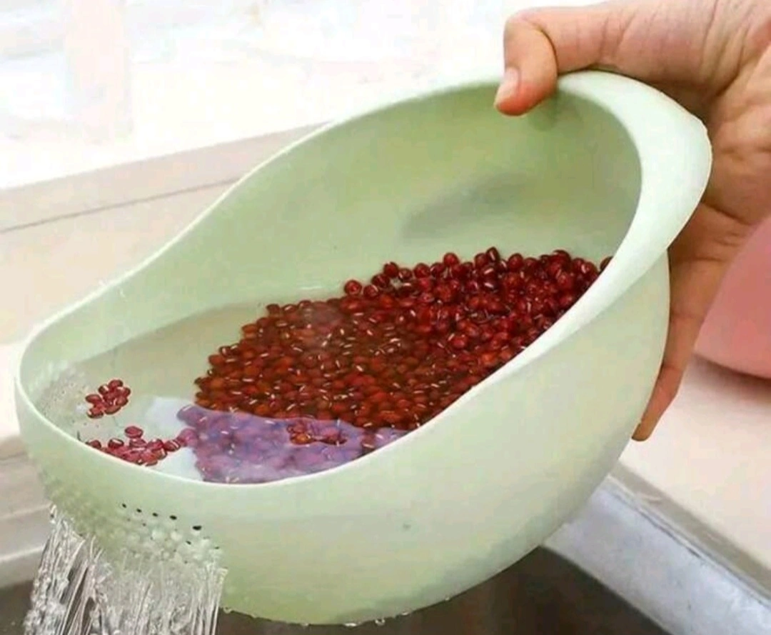 87This is a plastic rice washing bowl and colander. It measures approximately 8.86 inches in length, 6.69 inches in height, and 4.33 inches in width. It's perfect for washing rice, vegetables, and fruits!