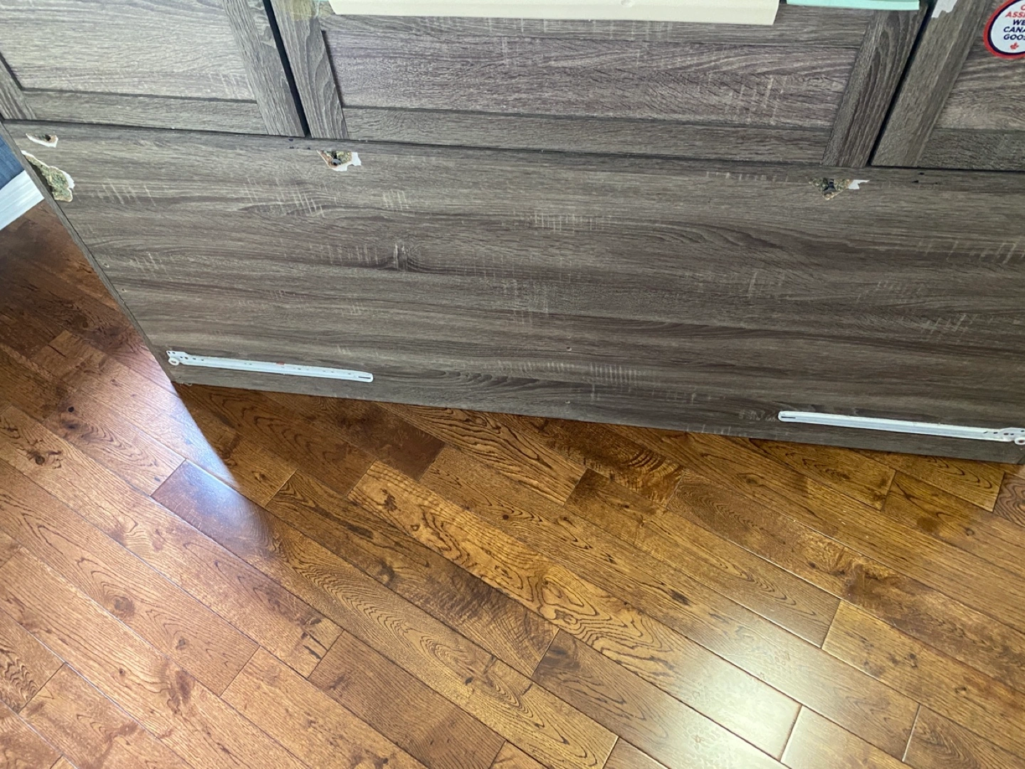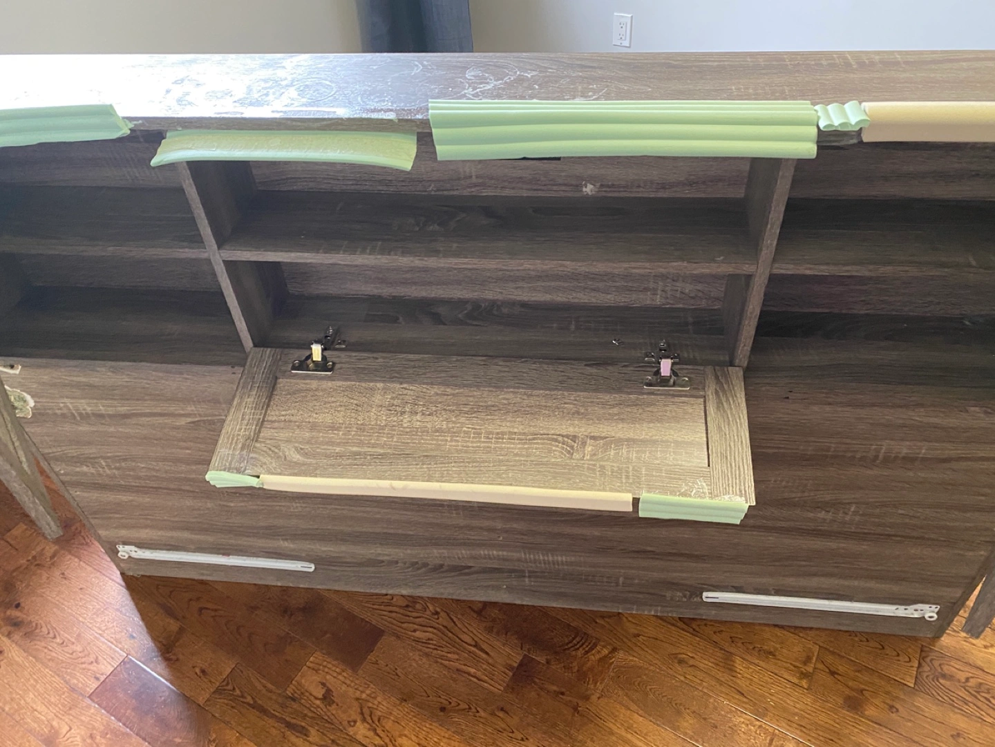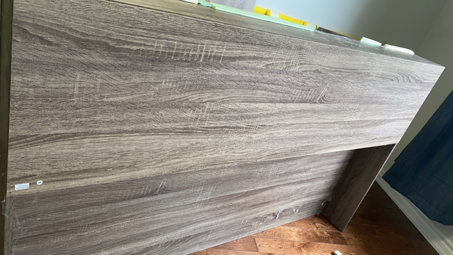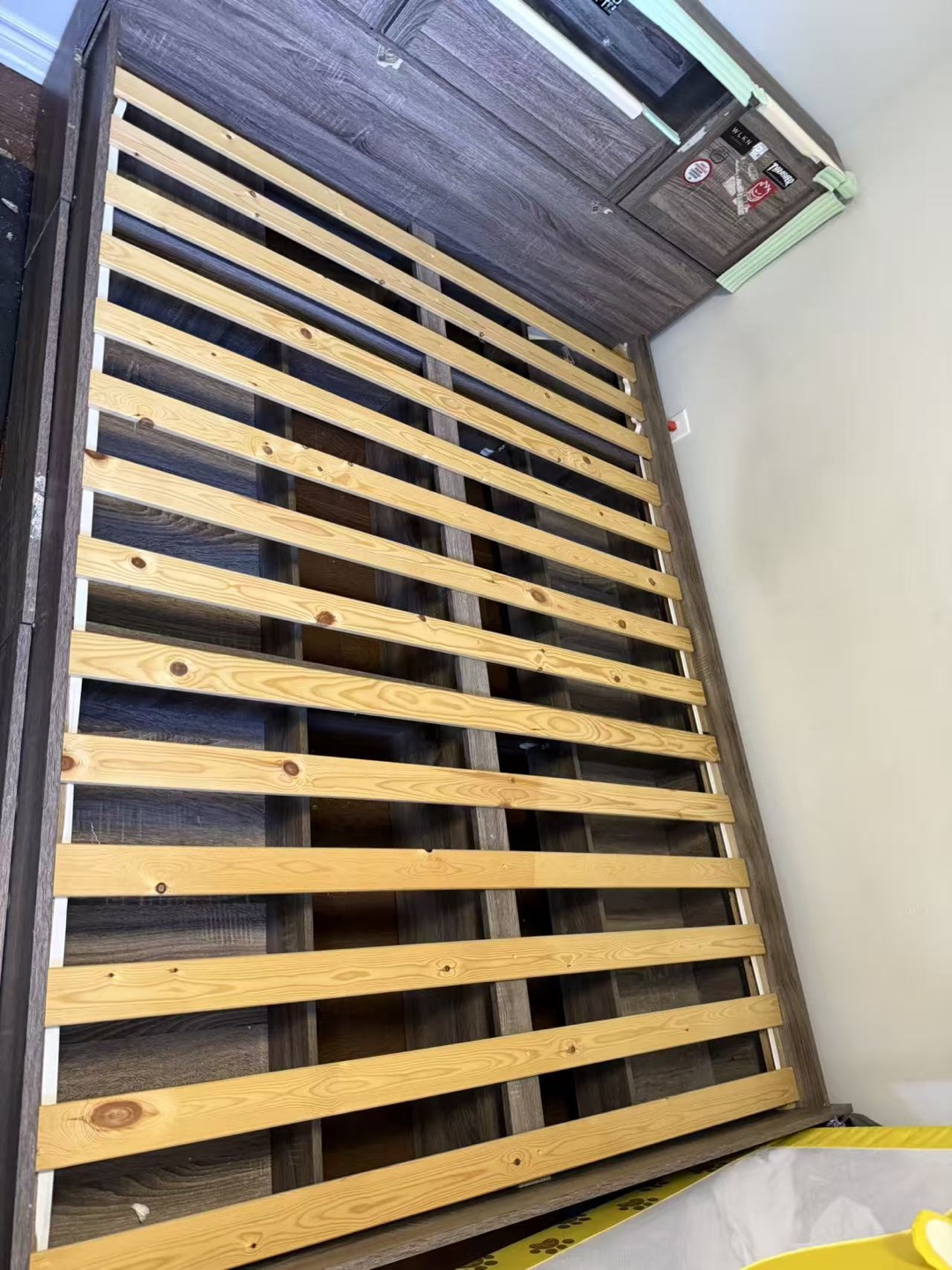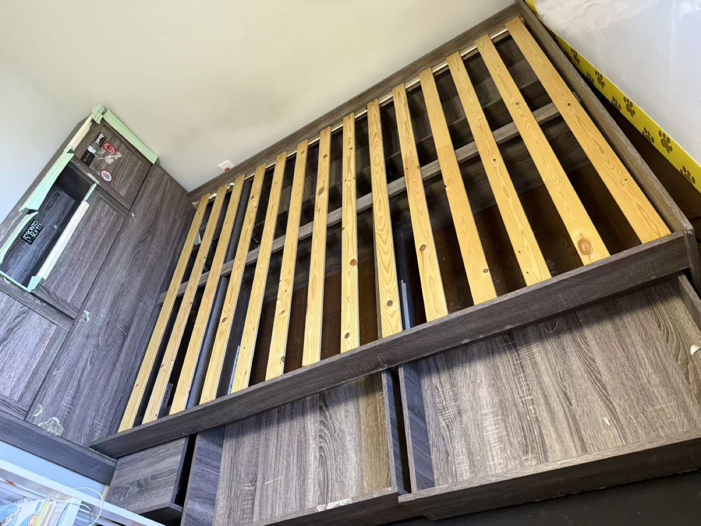 Selling a bed frame with a wood finish and built-in storage. It's in good condition and ready for a new home! Great for maximizing space in your bedroom.