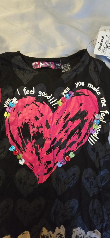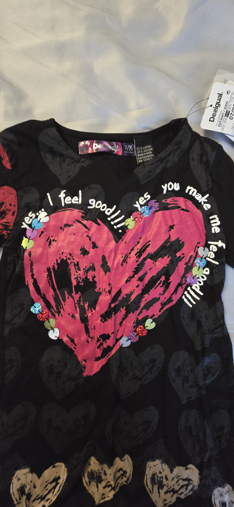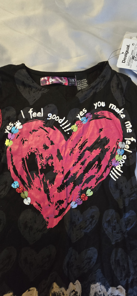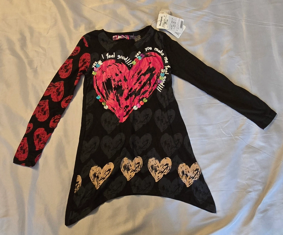 BRAND NEW WITH TAGS! This kids designer Desigual girls unique dress features a fun black design with colourful hearts! Size 7/8. Regular Price $59.95