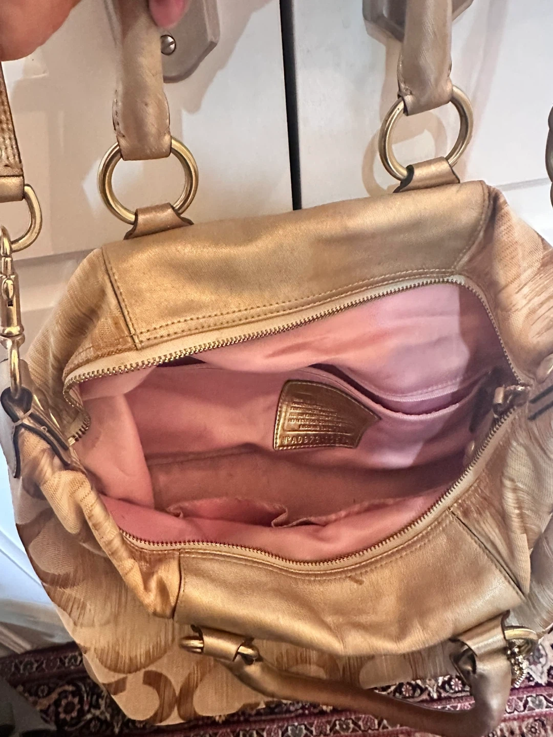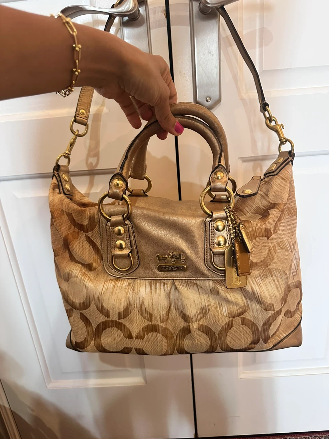 52Selling a beautiful Coach hobo bag in gold. It's in great condition and features a unique design. Perfect for everyday use!