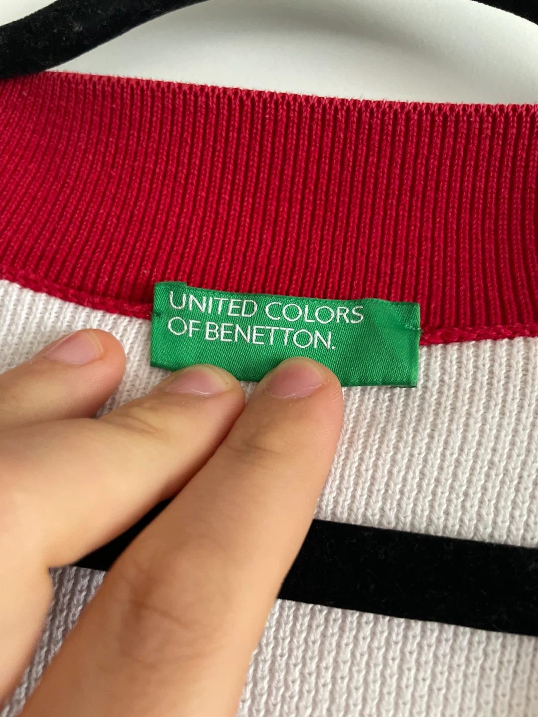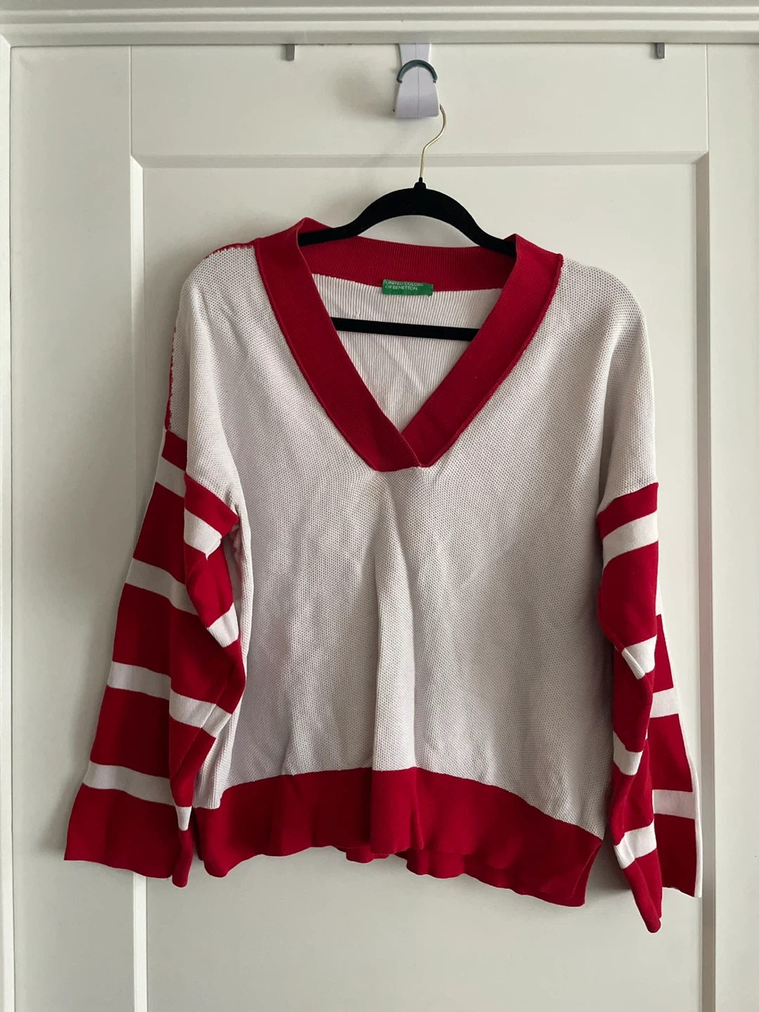 Selling a United Colors of Benetton sweater! It features a red and white colour scheme with a V-neck design. Perfect for adding a pop of colour to your wardrobe