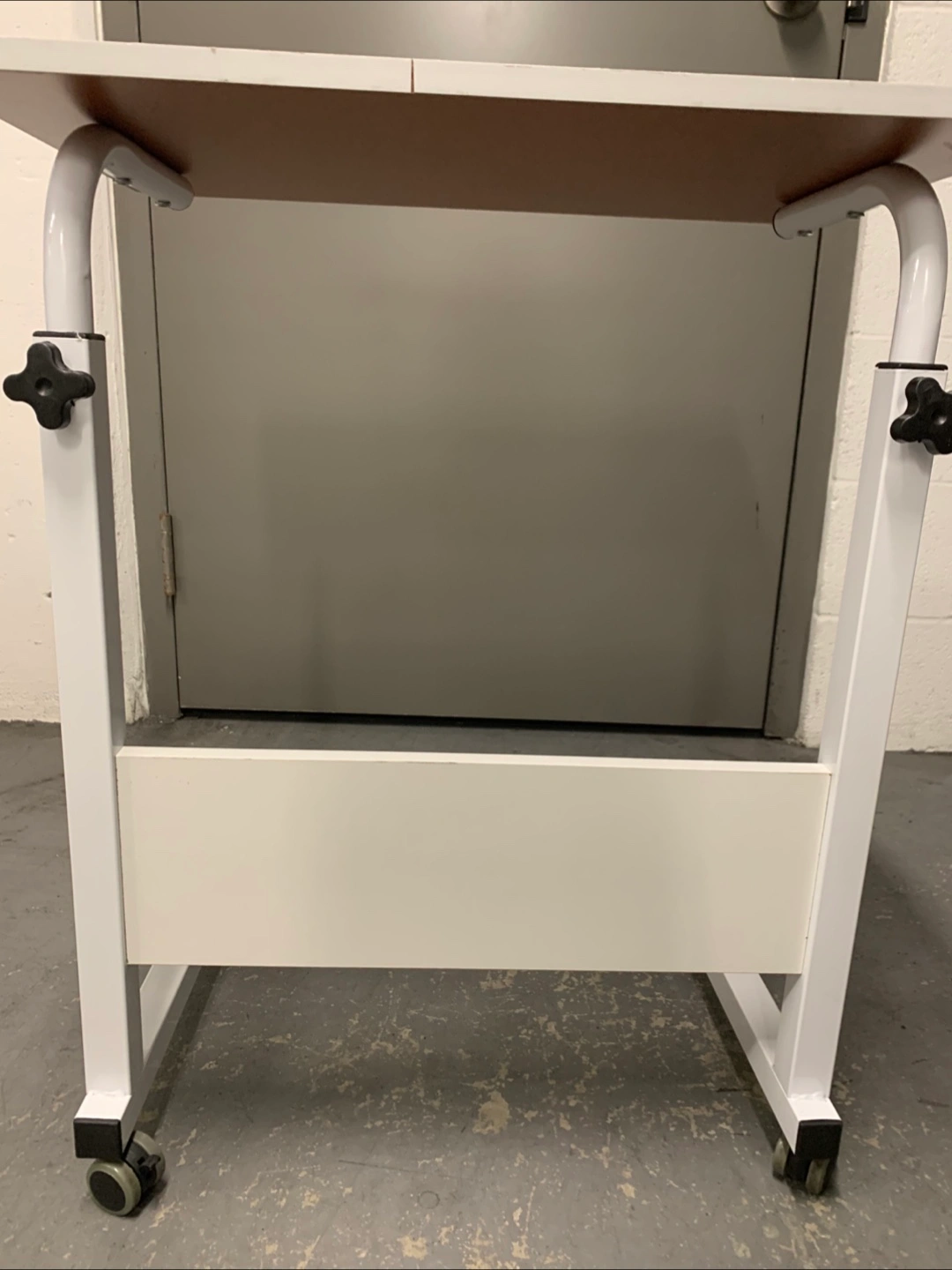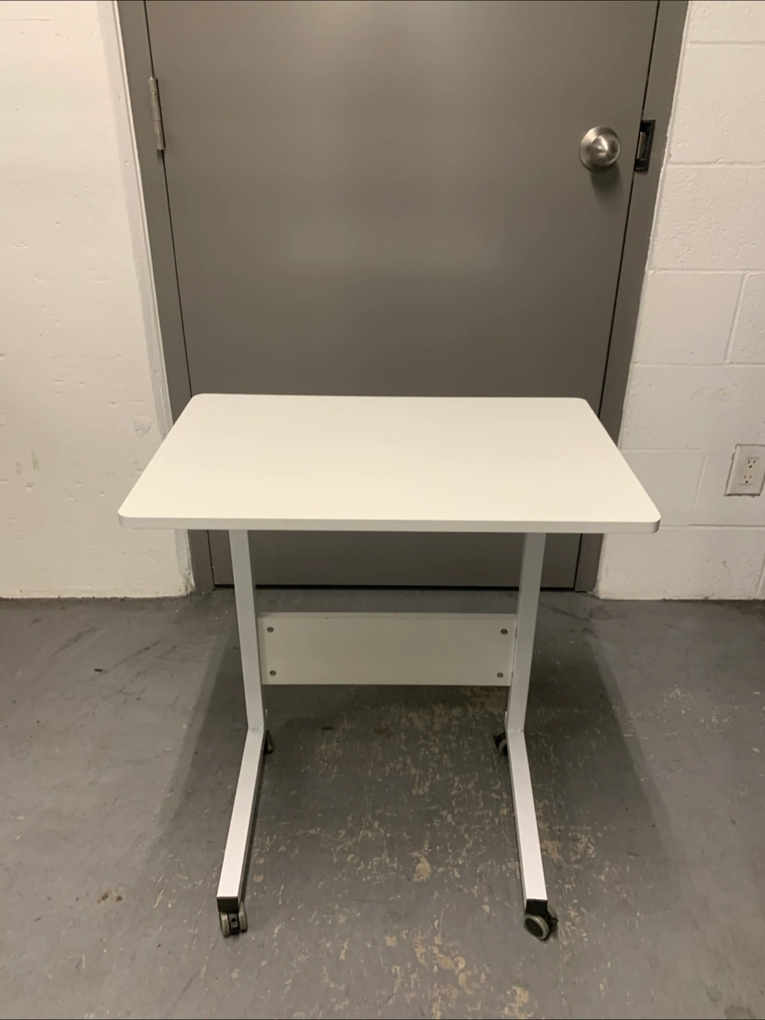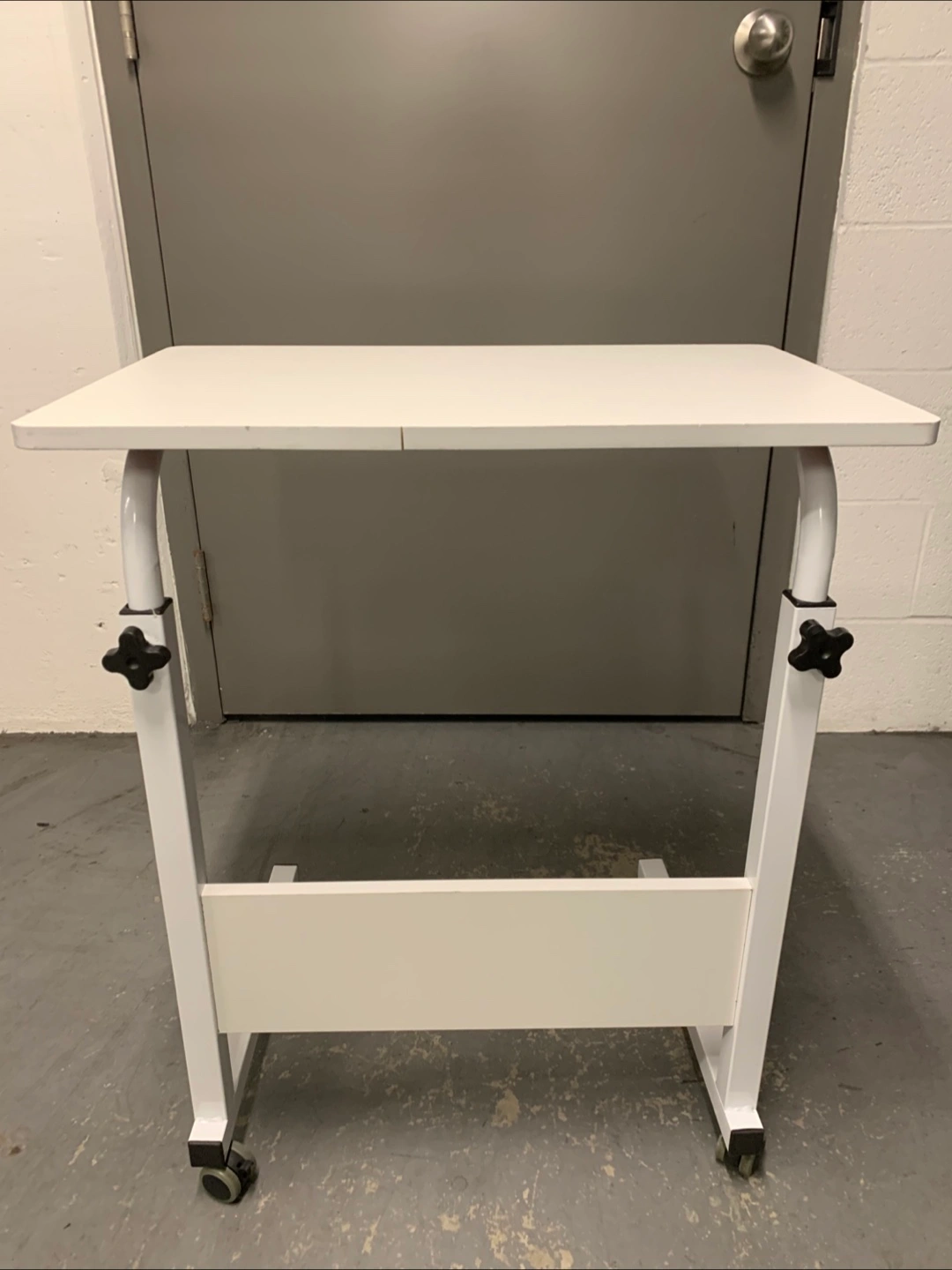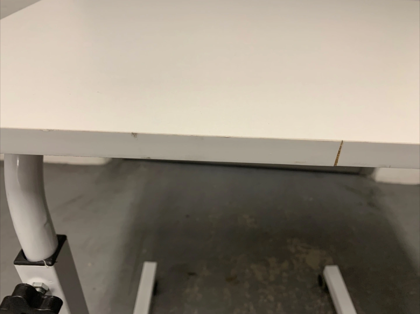 Selling a white rolling table with adjustable height! It's great for using as a laptop desk or for crafting, or simply eat in front of the TV. There are 2 signs of wear on the back edge of the table top (as shown in the photos). There’s also a couple cracks that seems to be only superficial see pic#9. It's still very functional and sturdy and you won’t regret to have access to it!