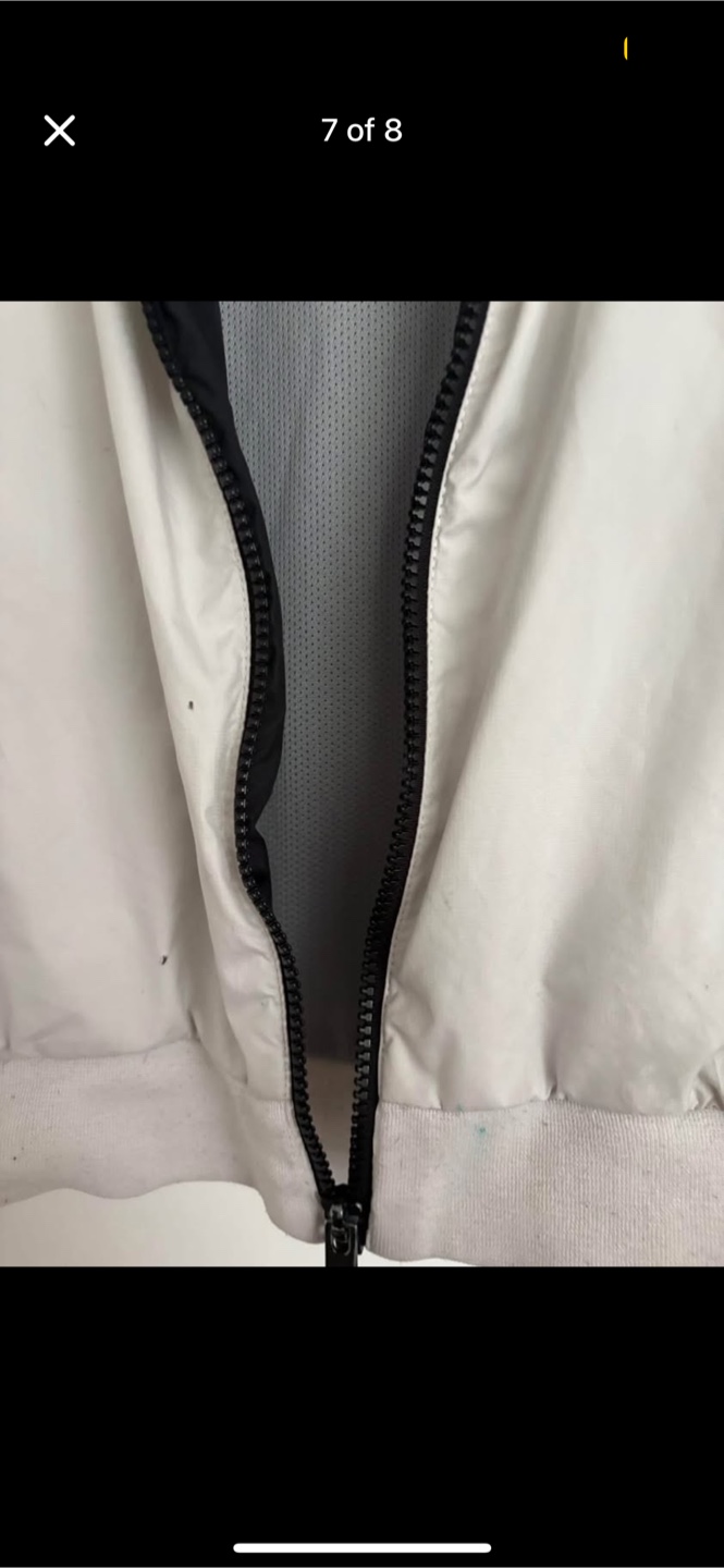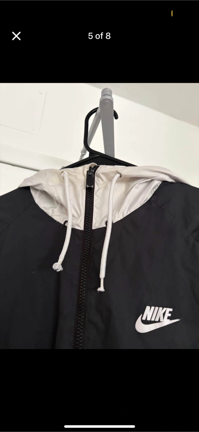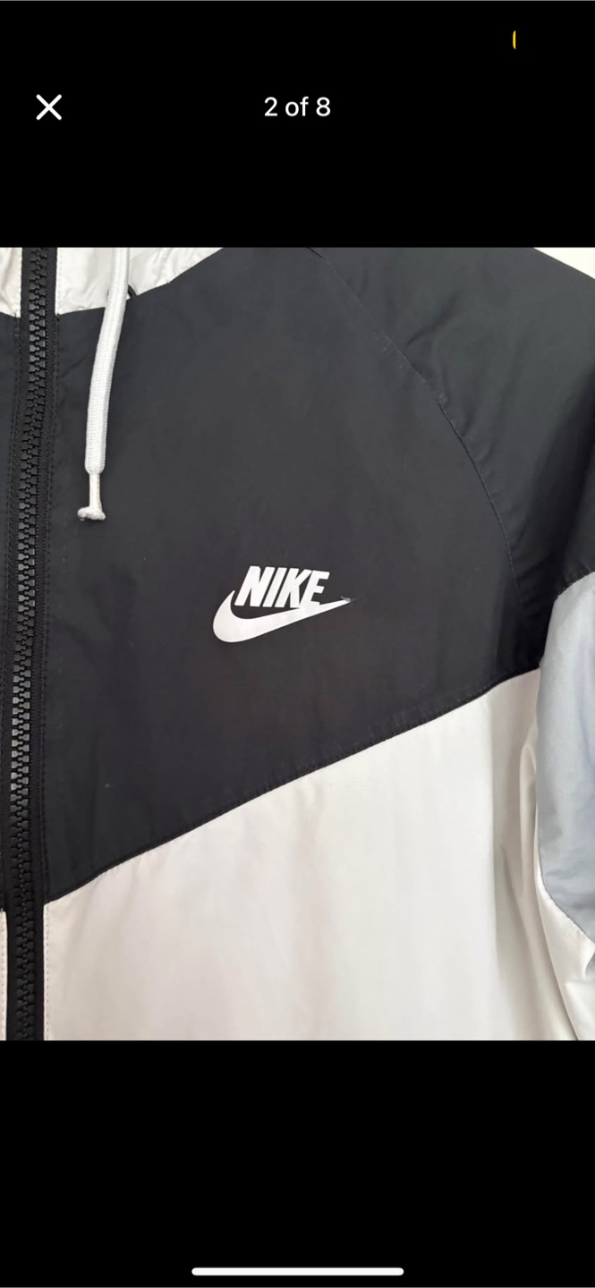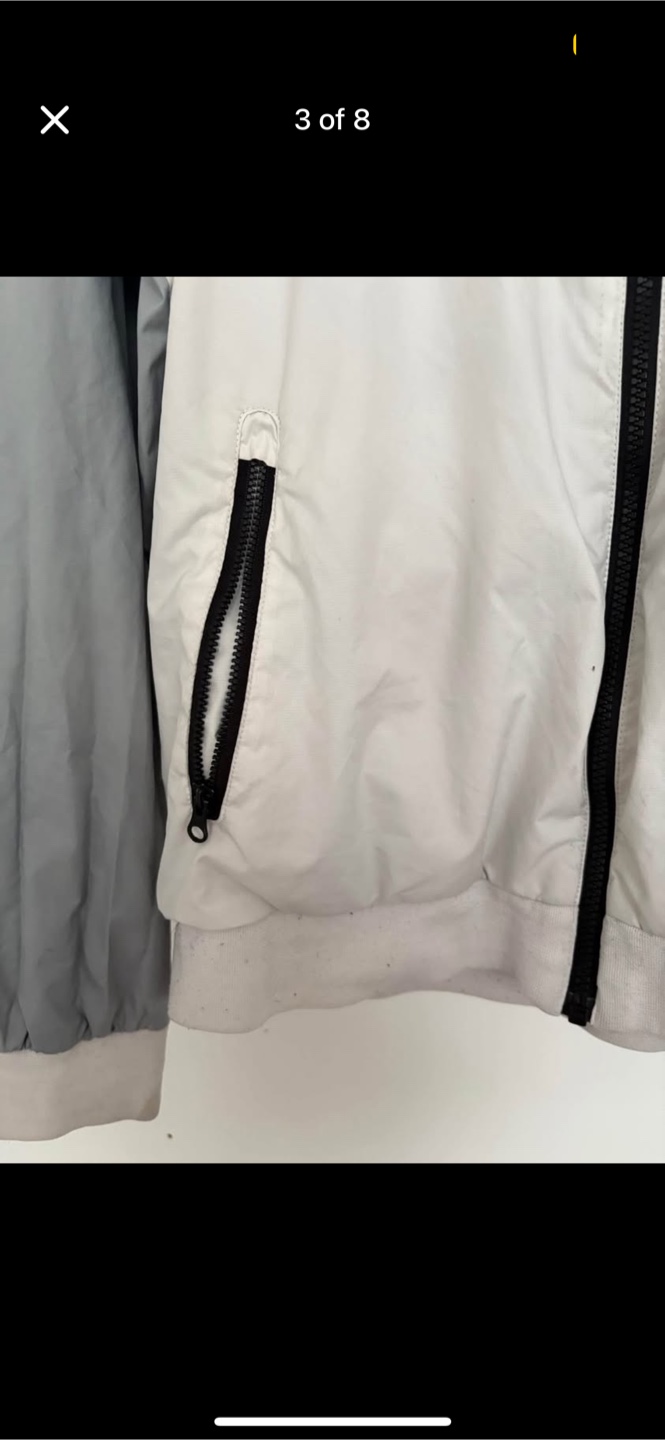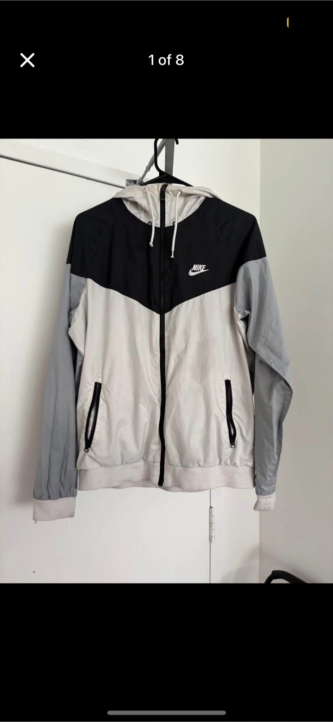 Selling a Nike windbreaker jacket in a cool colour block design! It features black, white, and grey panels, giving it a stylish look. The jacket has a hood and zippered pockets, perfect for keeping you protected from the elements. It's in great condition and ready for a new home