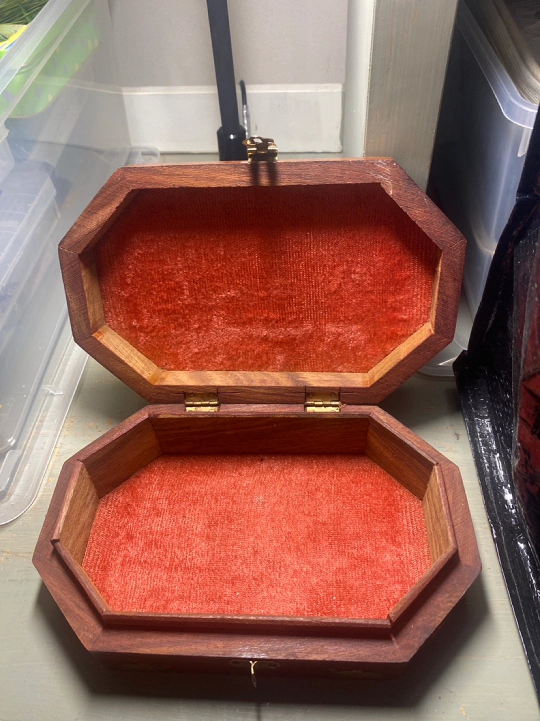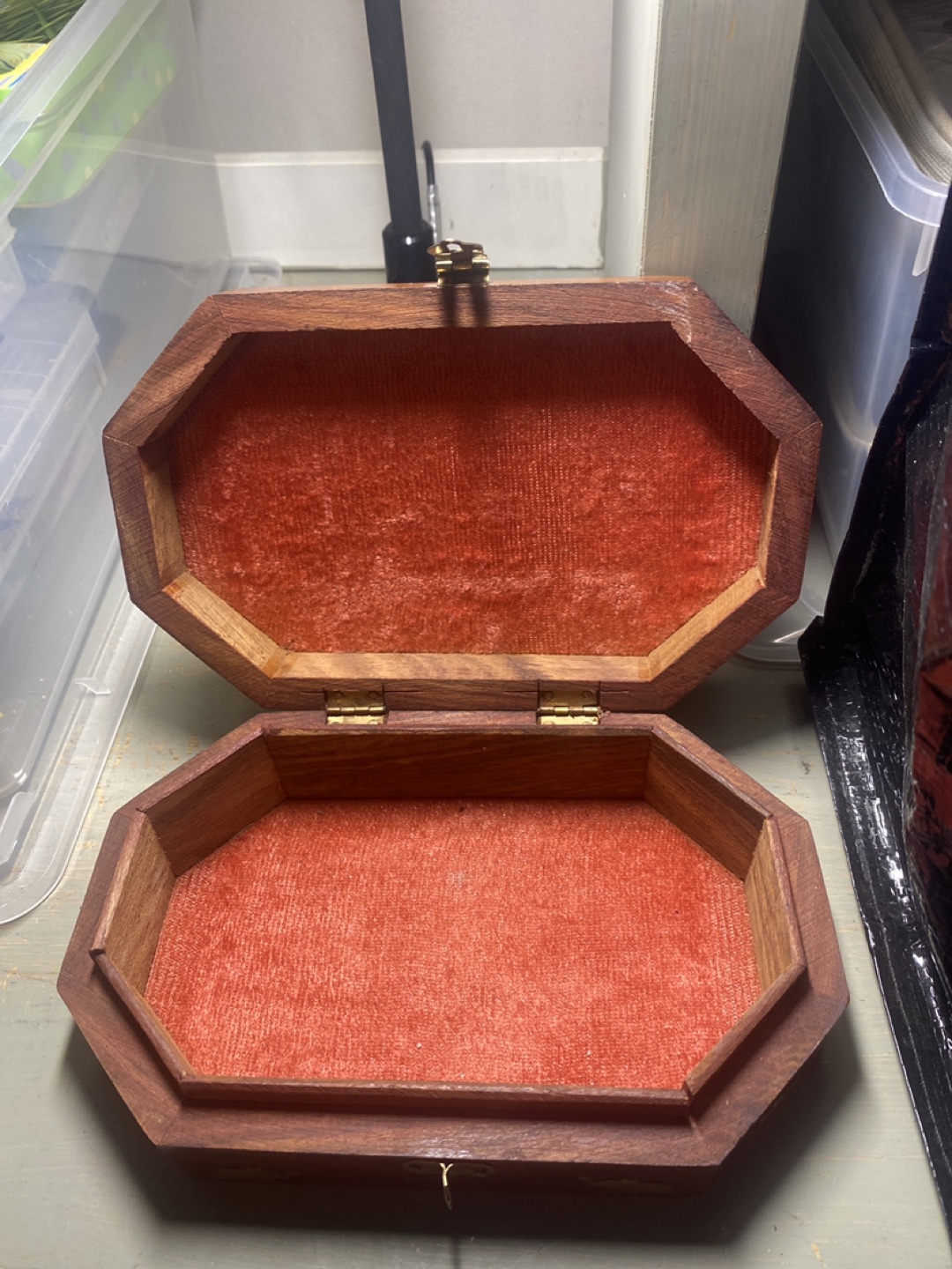 Here's a lovely wooden jewelry box! It features a unique elephant design and a soft, red velvet interior. Perfect for storing your precious items