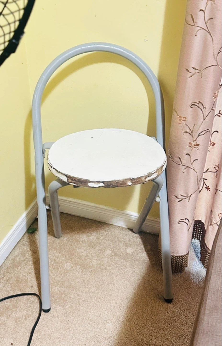 Selling a used but good hard material stool with a round, white seat and a grey metal frame. It's a simple and functional piece, perfect for extra seating. There are some signs of wear on the seat, as pictured. The price of this item is around $50 due to its high quality. But we offer you that you can negotiate our price. Thank you.