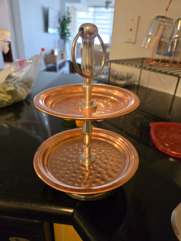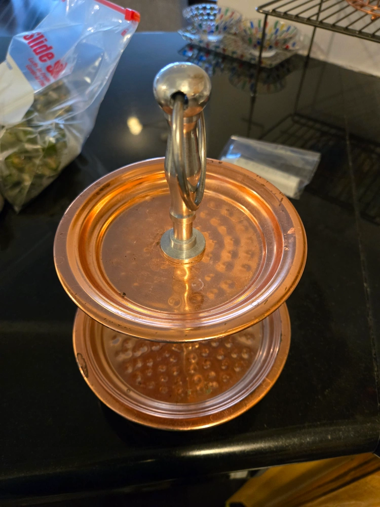 Selling a lovely copper two-tier serving stand! It's perfect for displaying desserts, appetizers, or even small decor items. The stand has a beautiful hammered texture and a sturdy construction. It would make a great addition to any kitchen or dining room