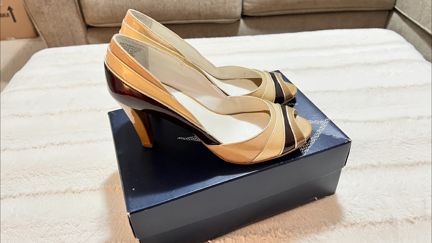 Anne Klein open toe high heels Beige & brown patent Size 8 From a smoke/pet free home Pickup North Oshawa - Windfields