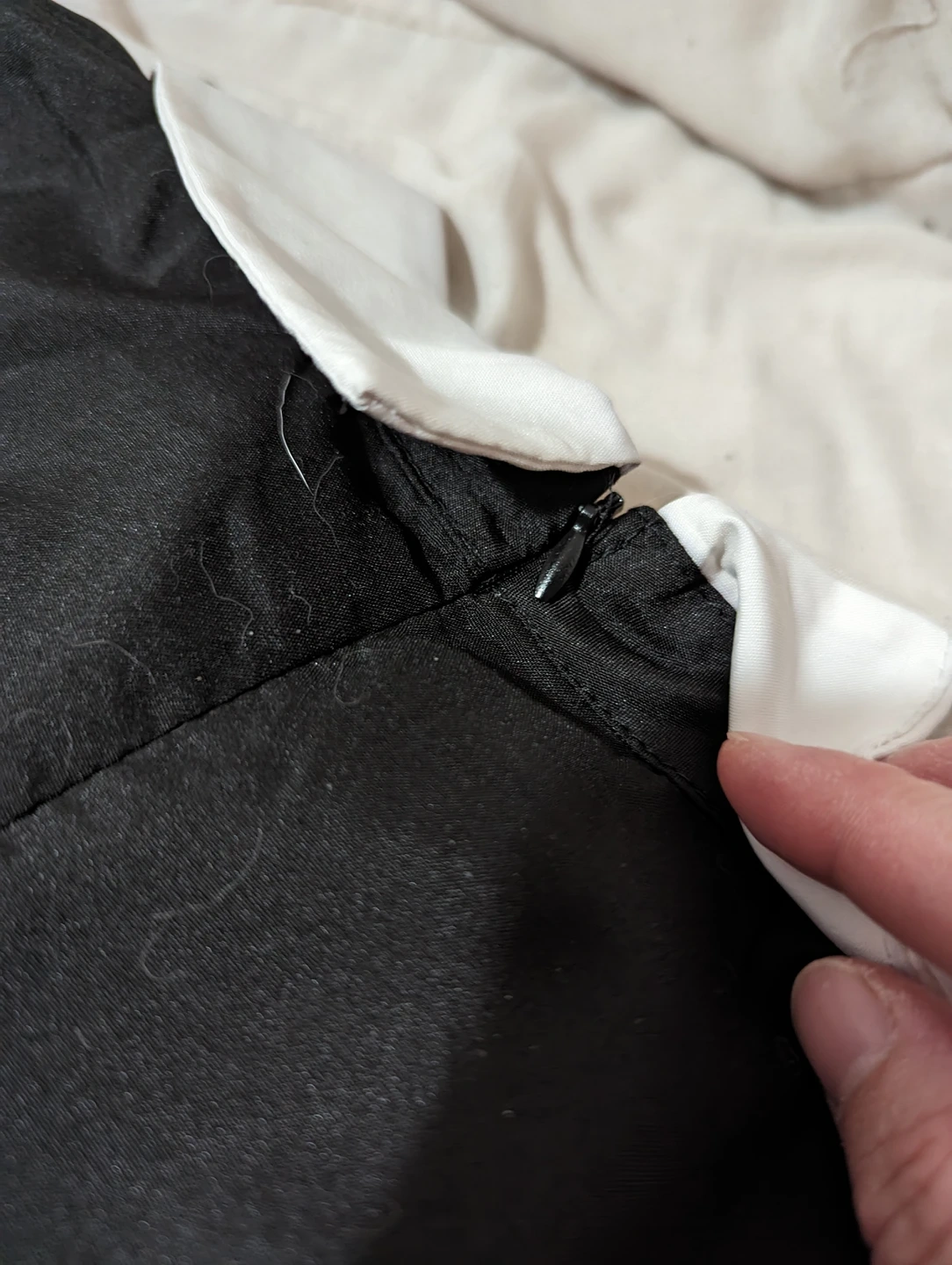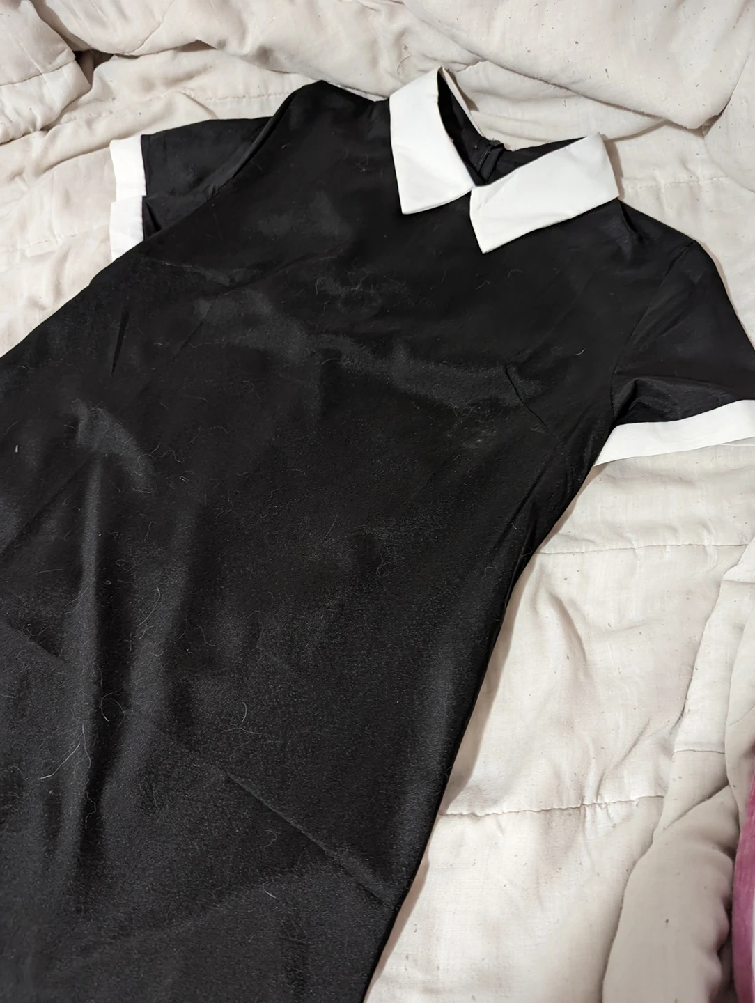 Zippered back, Black dress with a white collar.