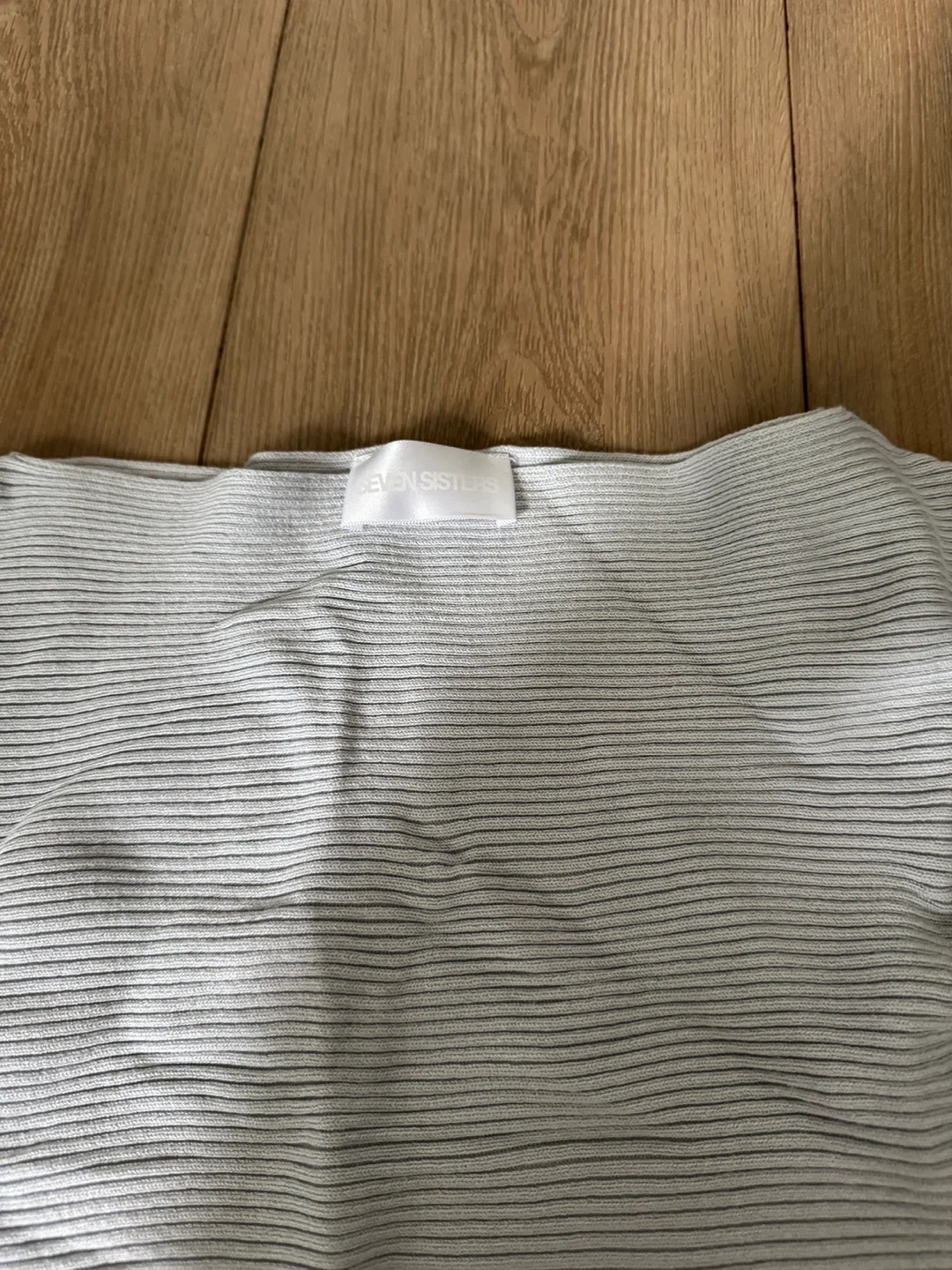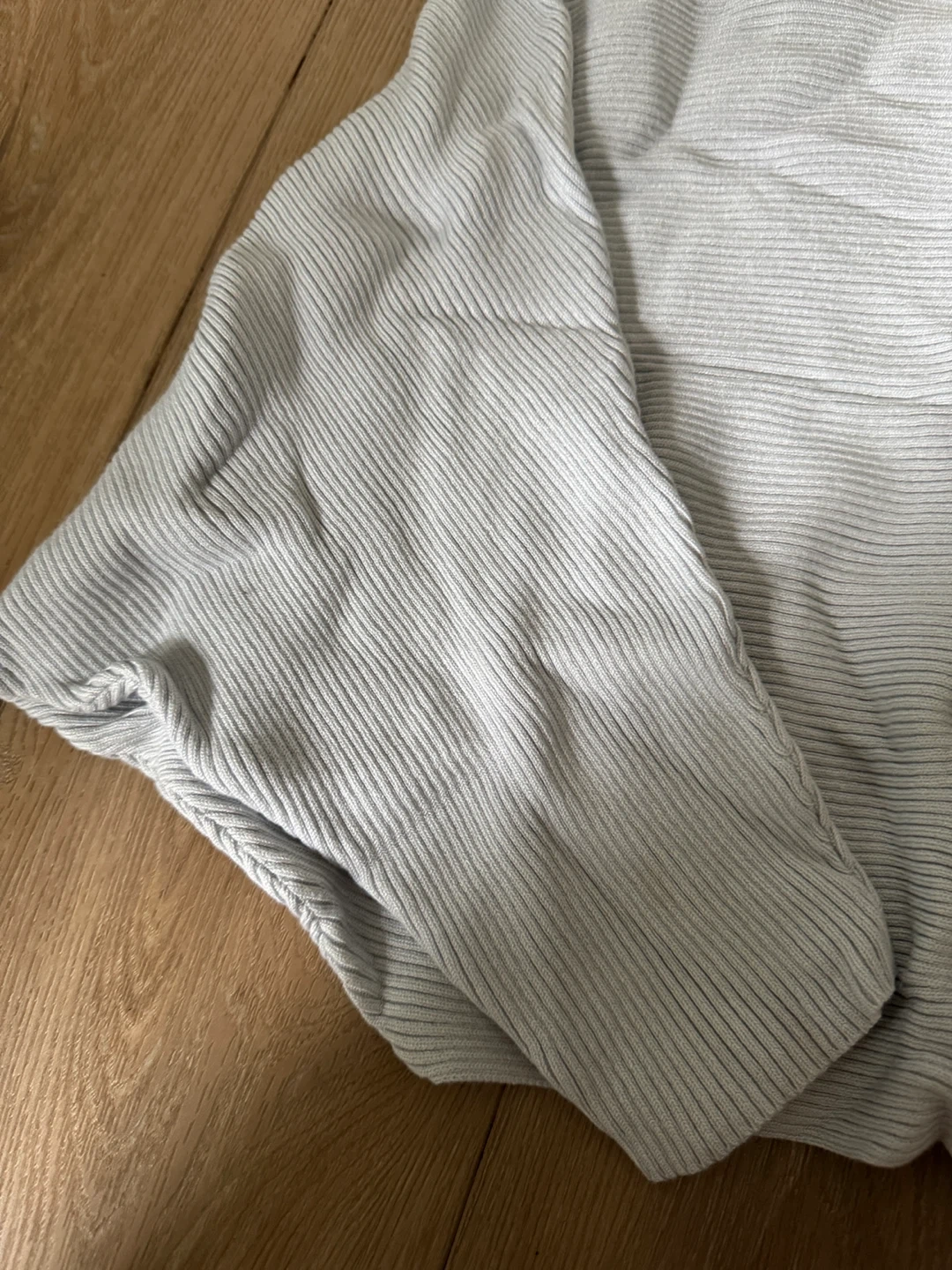 Selling a knit top from seven sisters! It's a light blue colour with a ribbed design. Wide arms that taper in around the elbow
