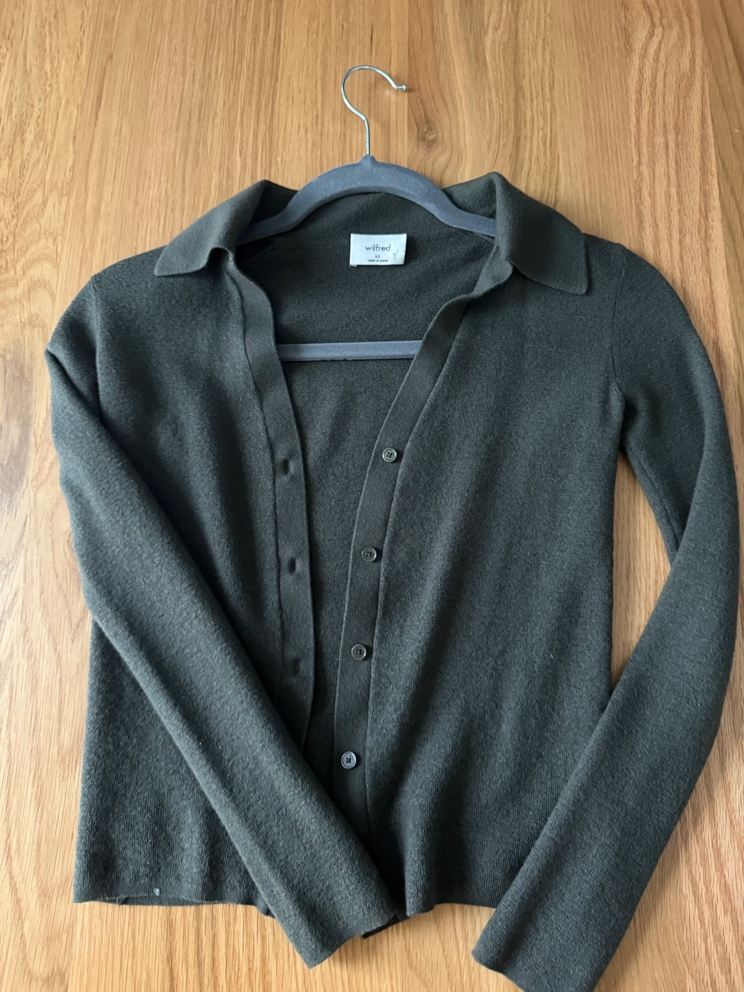 This is a Wilfred cardigan in size XS. It's a lovely olive green colour.