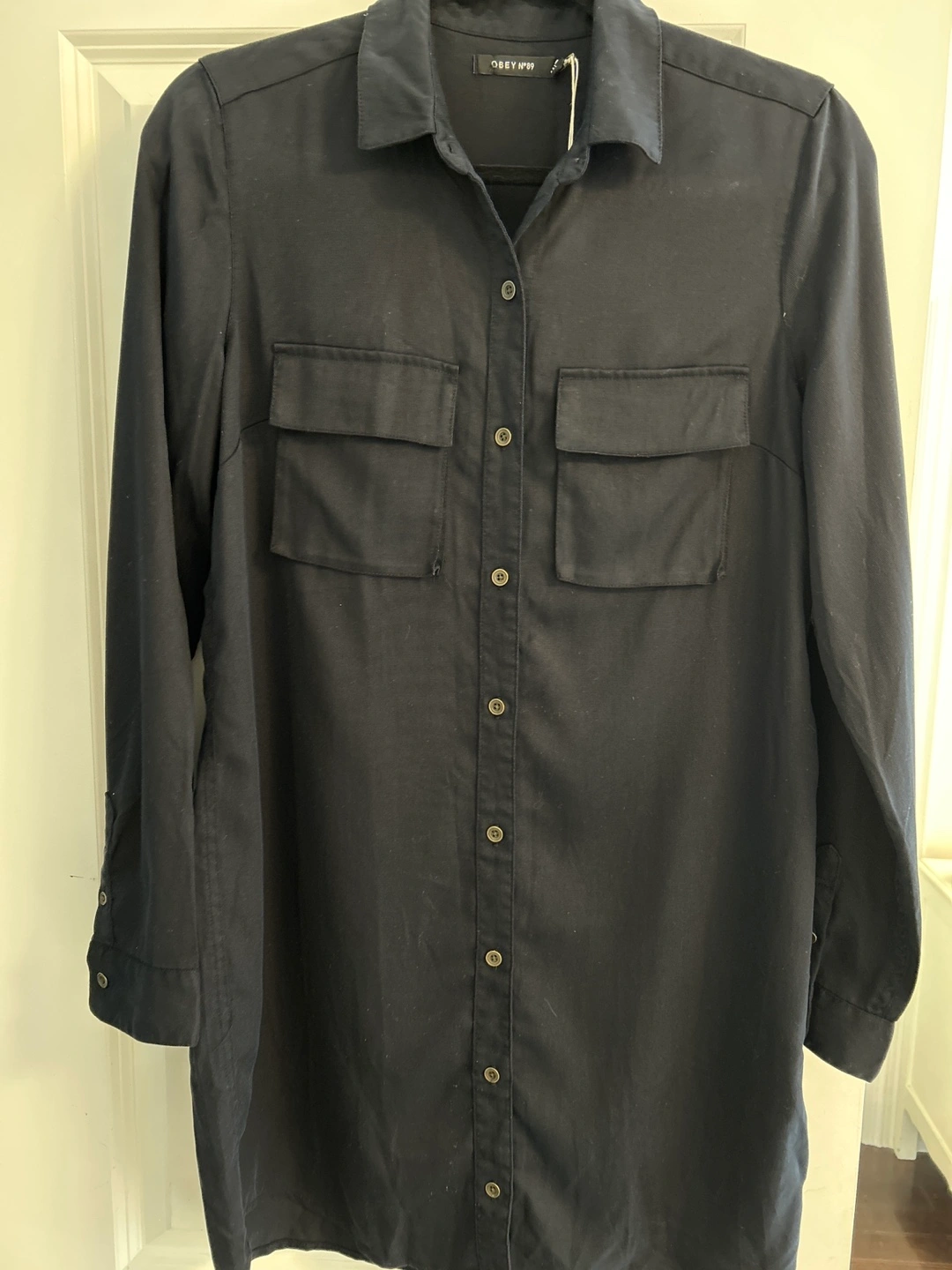Selling a stylish Obey N°89 Jetset dress in size medium! It's a black button-up shirt dress with two front pockets. Perfect for a casual yet put-together look. Retails for $130