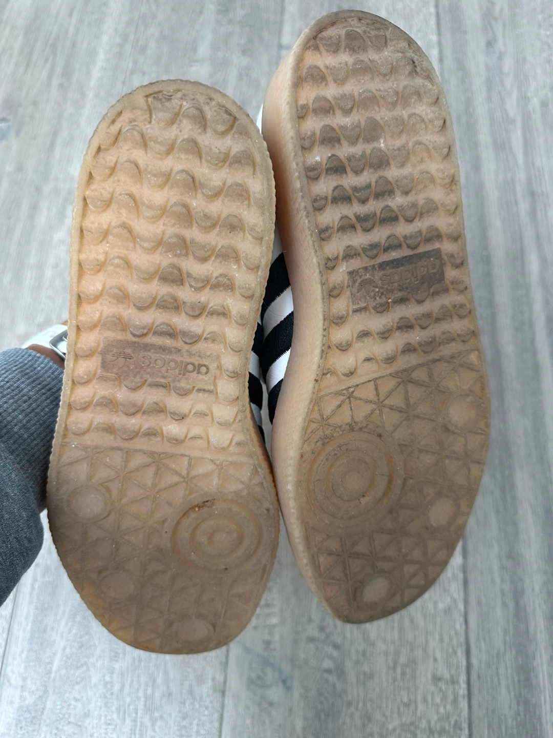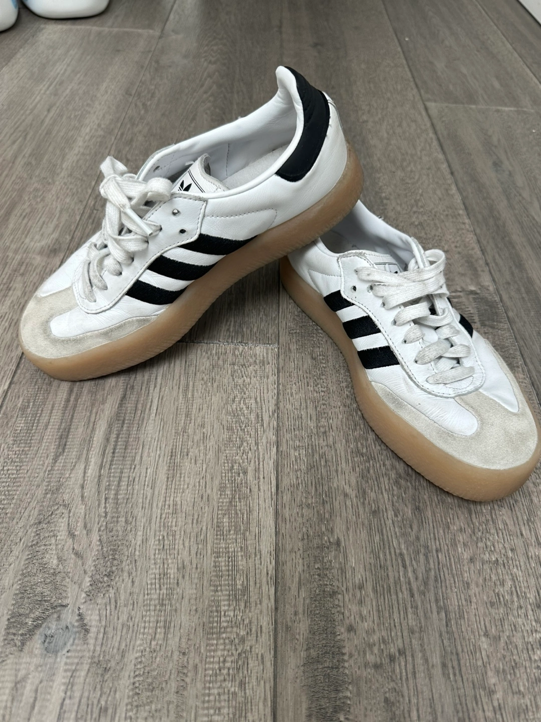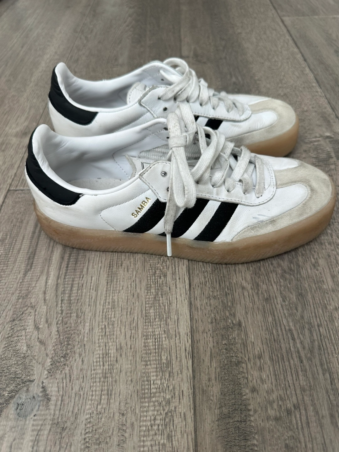 Selling a pair of Adidas Samba sneakers in white and black. They are women’s US size 7. These stylish sneakers are perfect for everyday wear!