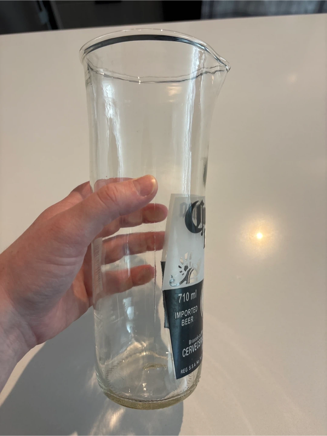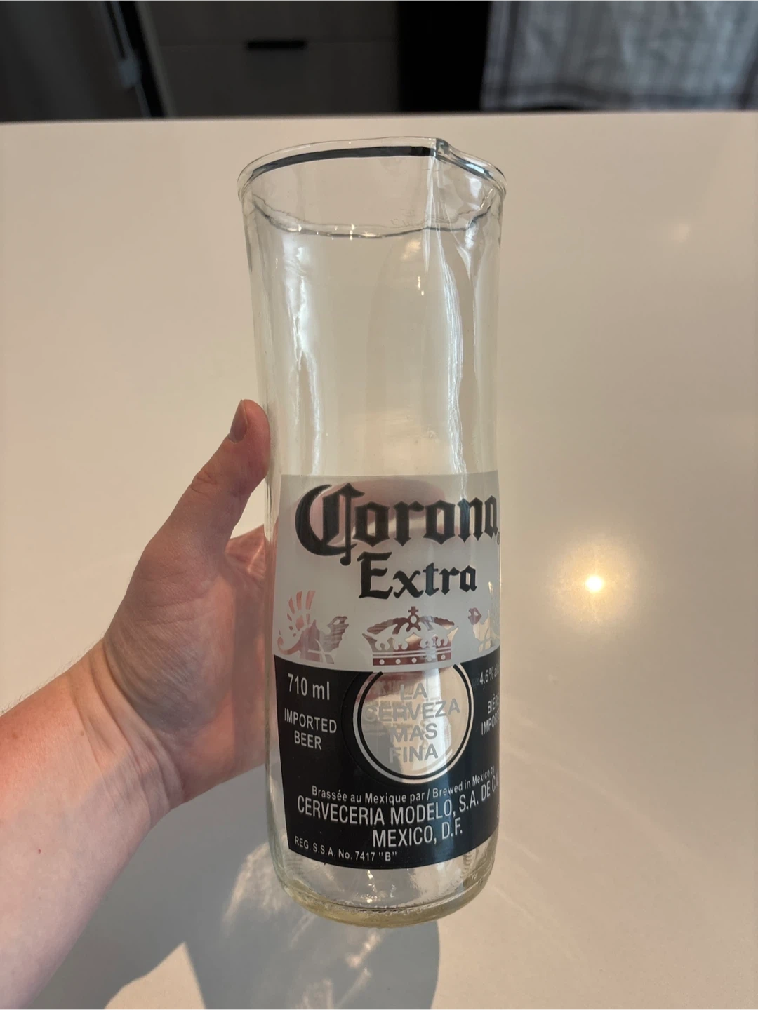 Selling a Corona Extra beer pitcher that’s been glass blown to stretch the bottle out and have a pour spout. It's a fun way to serve your favourite drinks