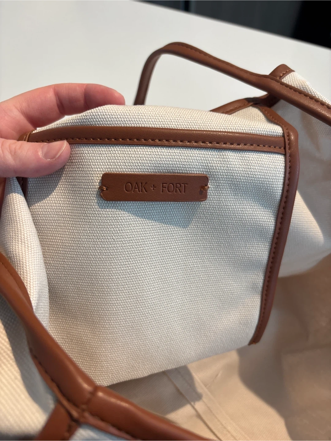 Looking to sell this Oak + Fort tote bag! It's a stylish and practical bag with a cream-coloured canvas body and brown faux-leather trim. Perfect for everyday use! No tags but never used. Flat base measures 11” x 5” and straps are 10” long from top of bag