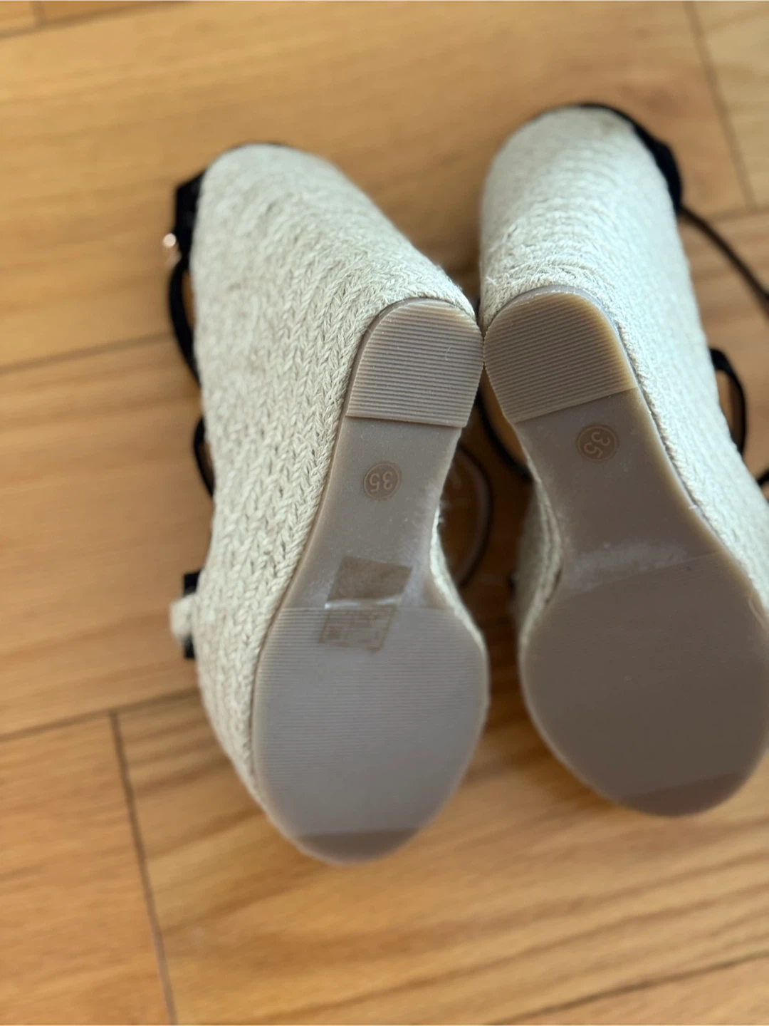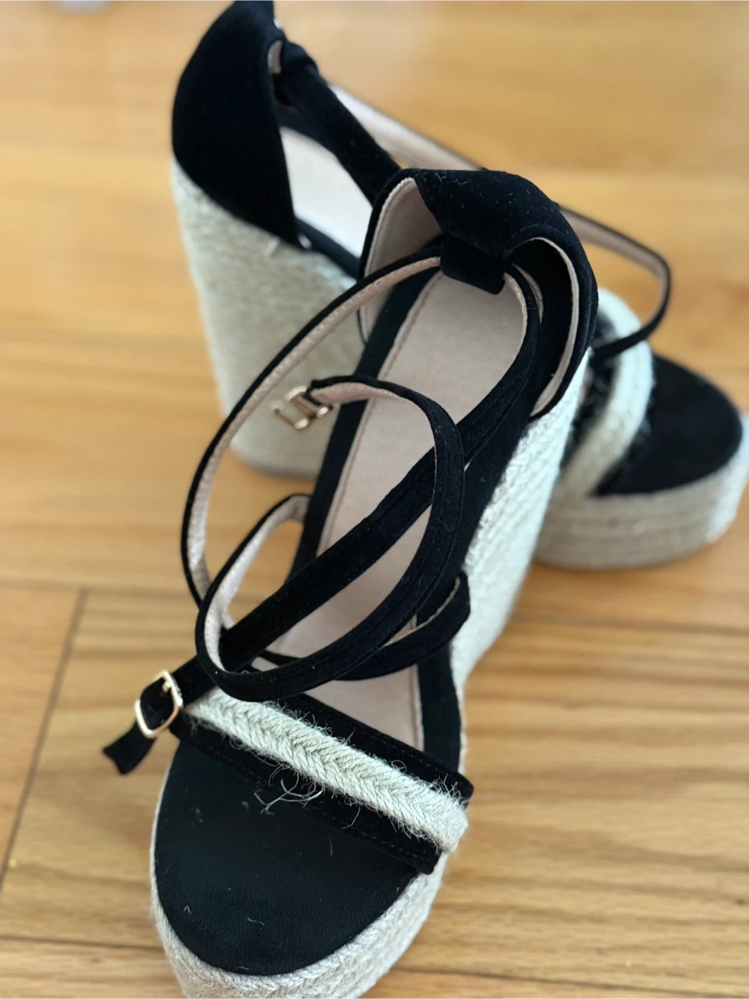 Cute pair of wedge espadrille sandals in black and beige! These are a size 5 (US sizing). They feature a jute-wrapped wedge heel and black suede straps. Perfect for summer!