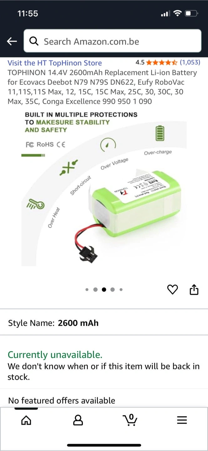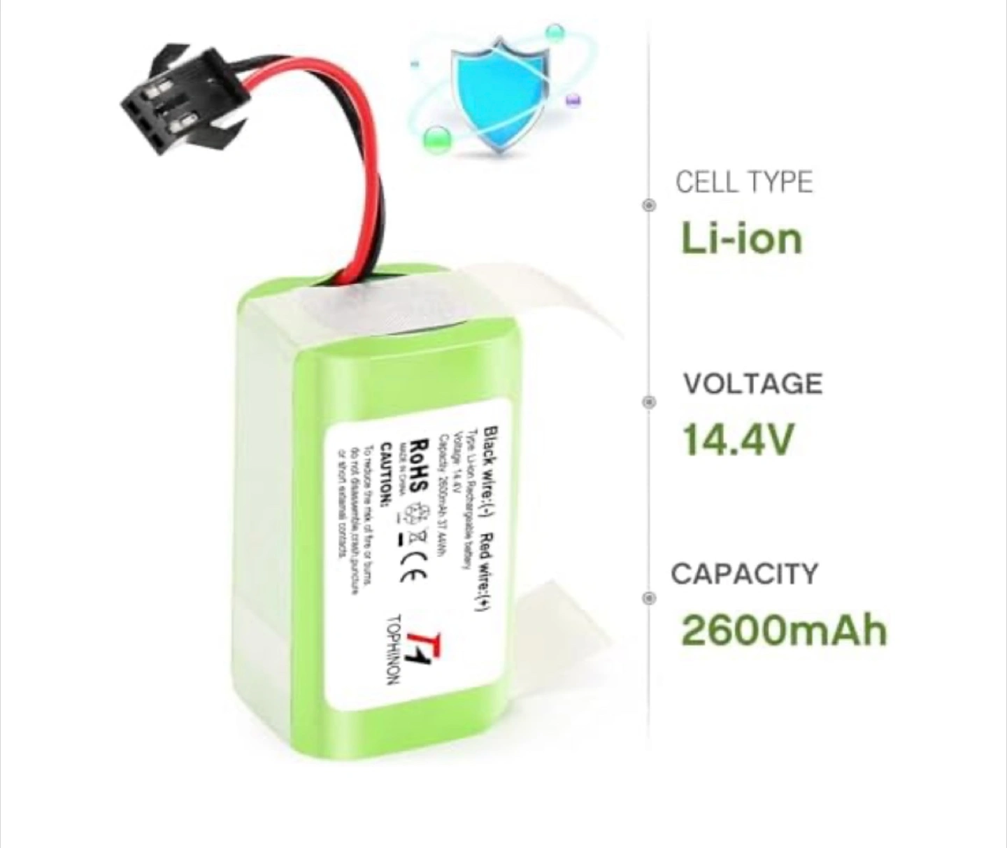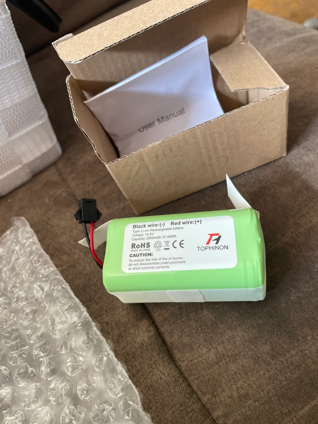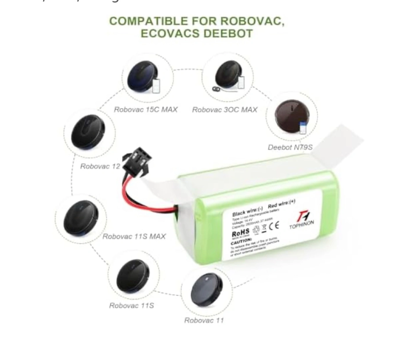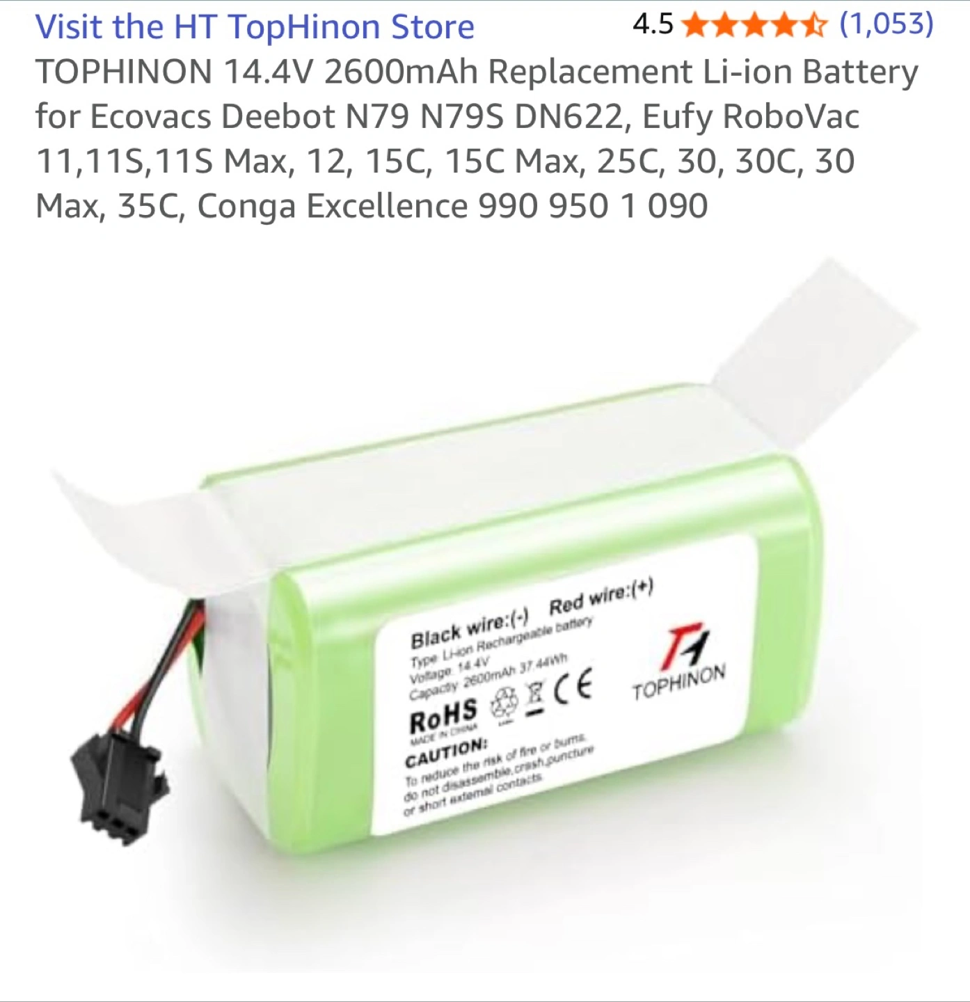 422Selling a TOPHINON 14.4V 2600mAh replacement Li-ion battery for Ecovacs Deebot and Eufy RoboVac models. It's compatible with Deebot N79, N79S, DN622, Eufy RoboVac 11, 11S, 11S Max, 12, 15C, 15C Max, 25C, 30, 30C, 30 Max, 35C, and Conga Excellence 990, 950, and 1090 models. Comes with the user manual and original box