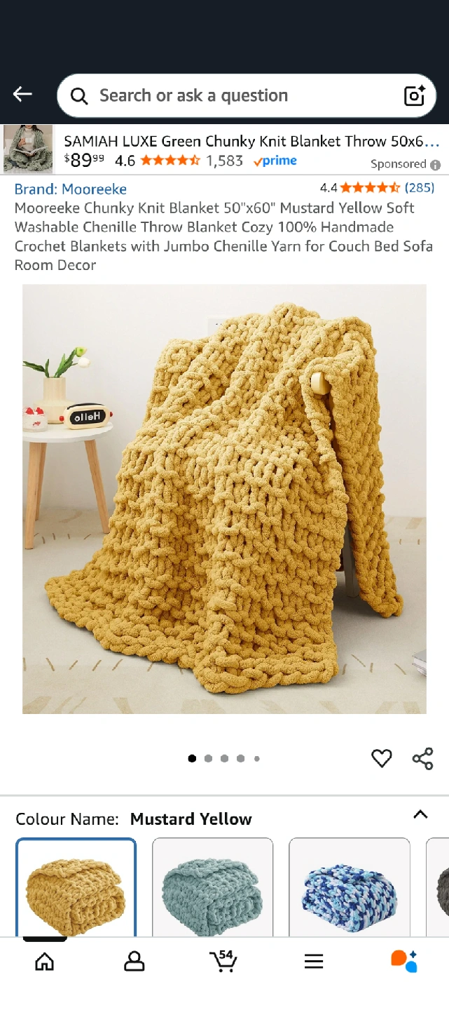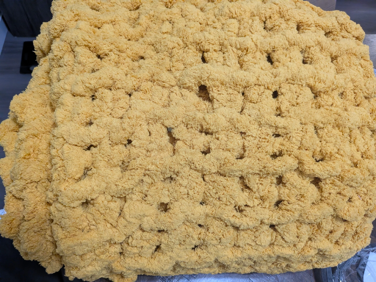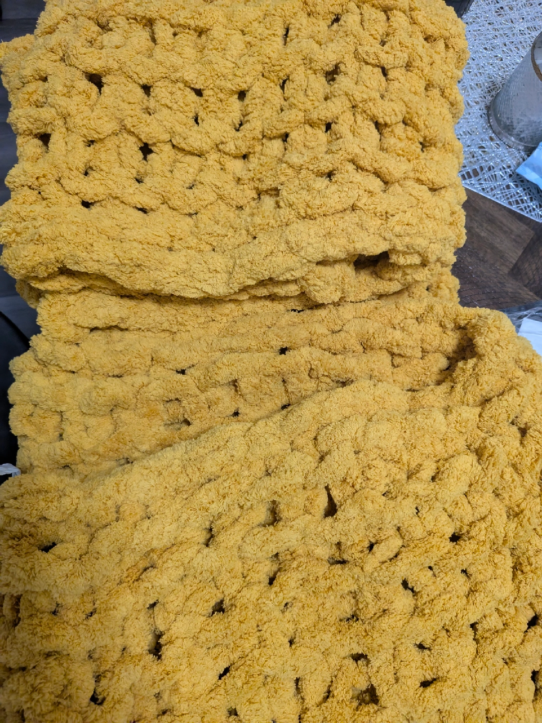 Snuggle up with this super cozy Mooreecke chunky knit blanket! It's a lovely mustard yellow colour and measures 50"x60". This blanket is 100% handmade with excellent craftsmanship, making it both firm and durable. It's also soft and skin-friendly, moisture-breathable, and has good rebound resilience with fine and dense fibers.