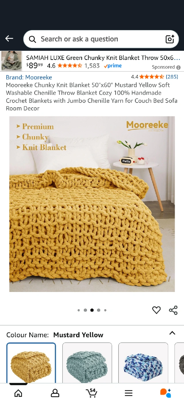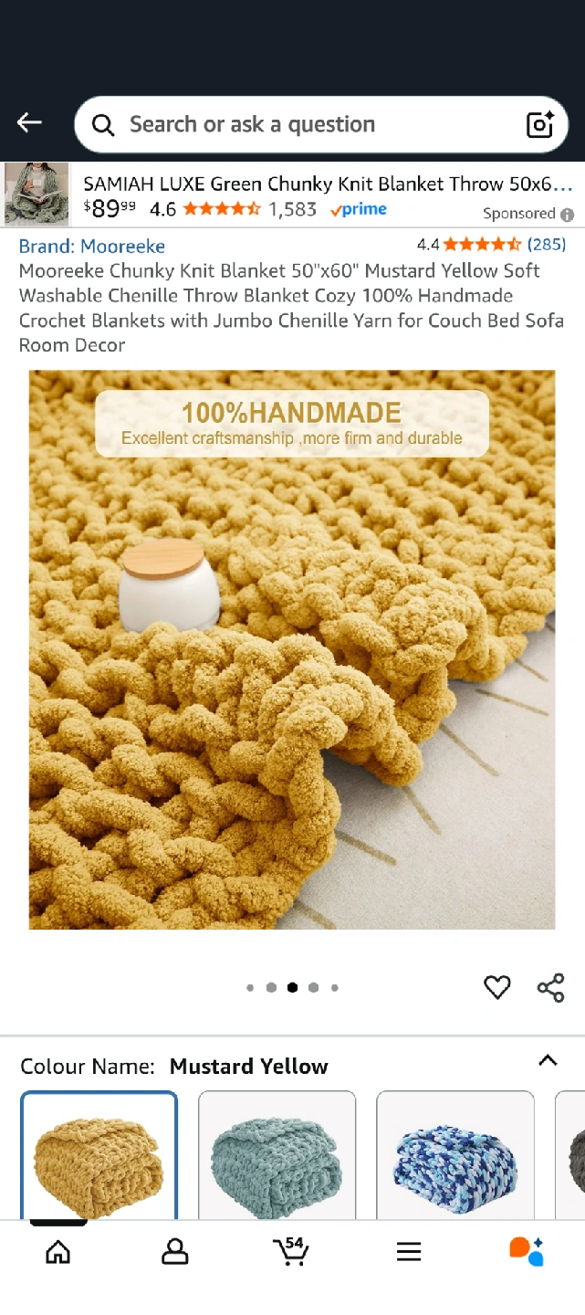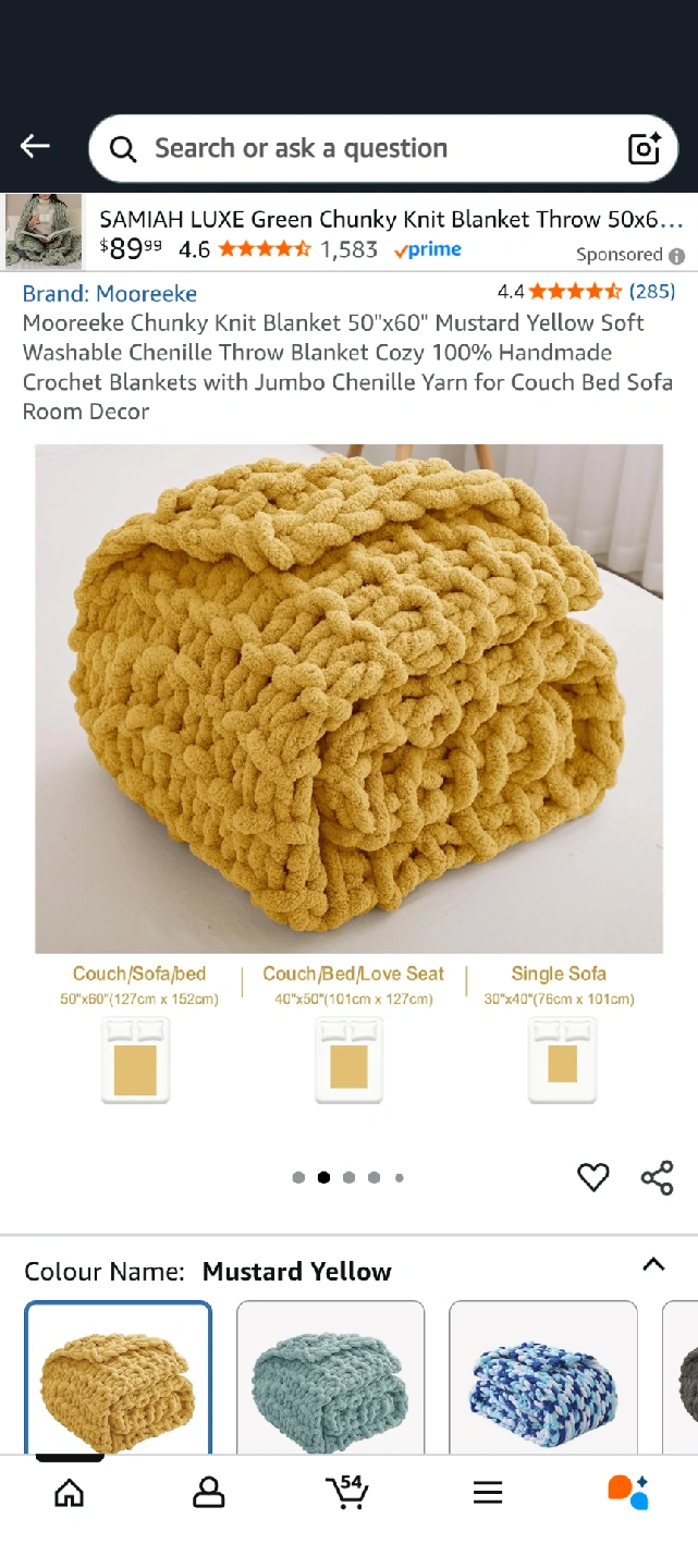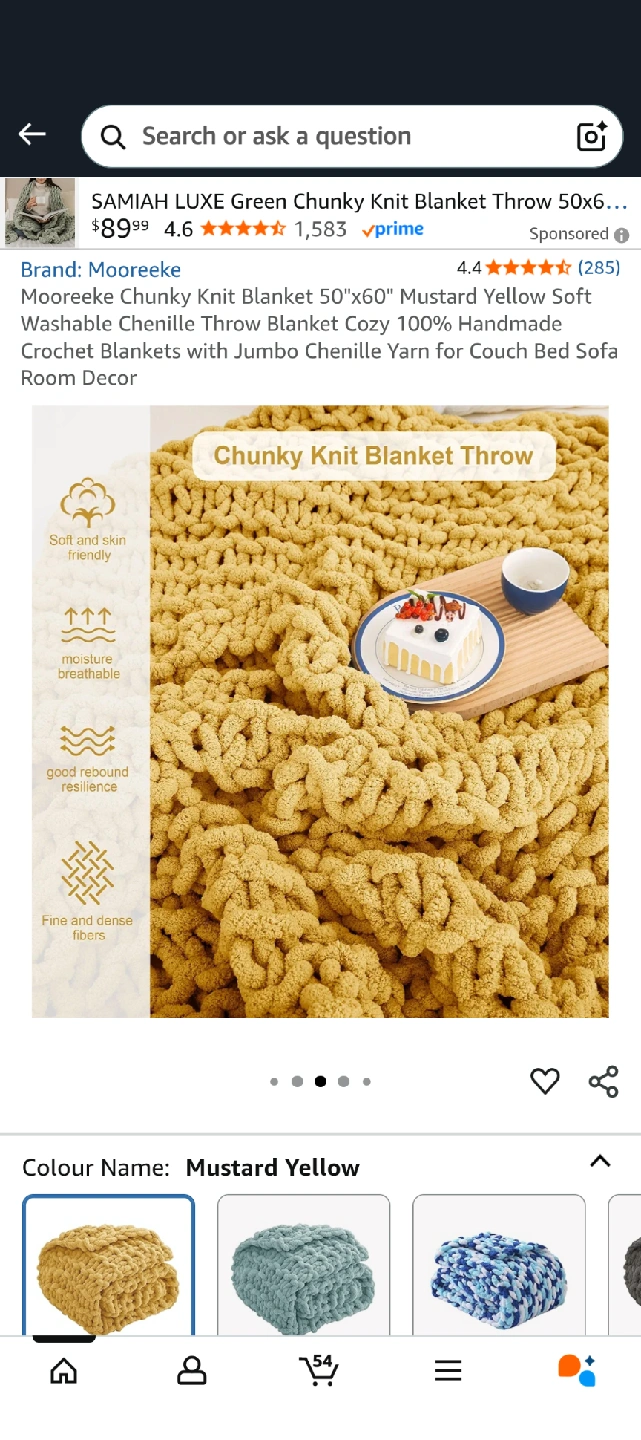 Snuggle up with this super cozy Mooreecke chunky knit blanket! It's a lovely mustard yellow colour and measures 50"x60". This blanket is 100% handmade with excellent craftsmanship, making it both firm and durable. It's also soft and skin-friendly, moisture-breathable, and has good rebound resilience with fine and dense fibers.