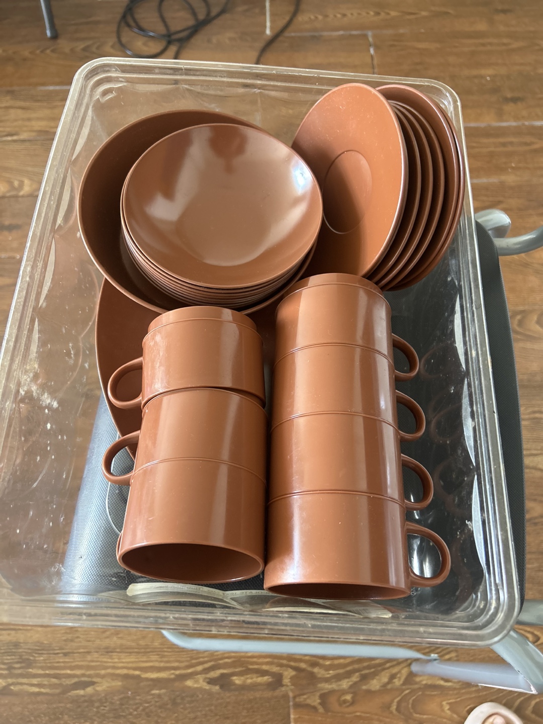 Selling a set of vintage melamine dishes in a lovely brown colour. Includes plates, saucers, and cups. Perfect for adding a retro touch to your kitchen!