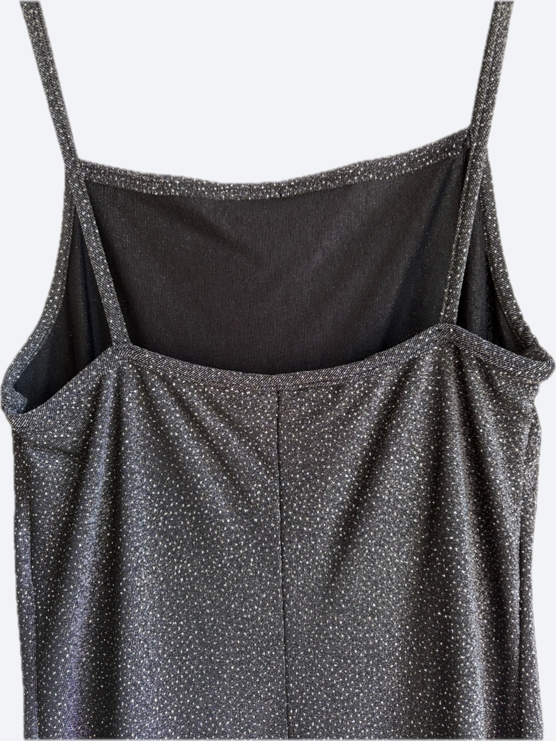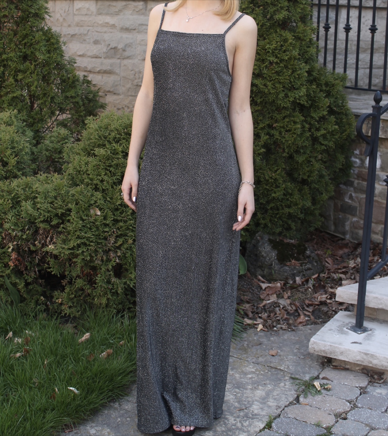Chic metallic sparkly gray maxi dress by Jump. Features a sleek silhouette and spaghetti straps. Perfect for evening wear. Excellent condition.