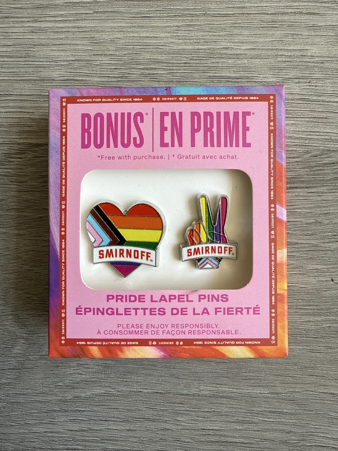 Selling a set of Smirnoff Pride lapel pins, brand new in the box! These pins are a bonus item, perfect for adding a touch of pride to your outfit or collection. The box indicates they are a 'Bonus en Prime' item, making them a unique find!