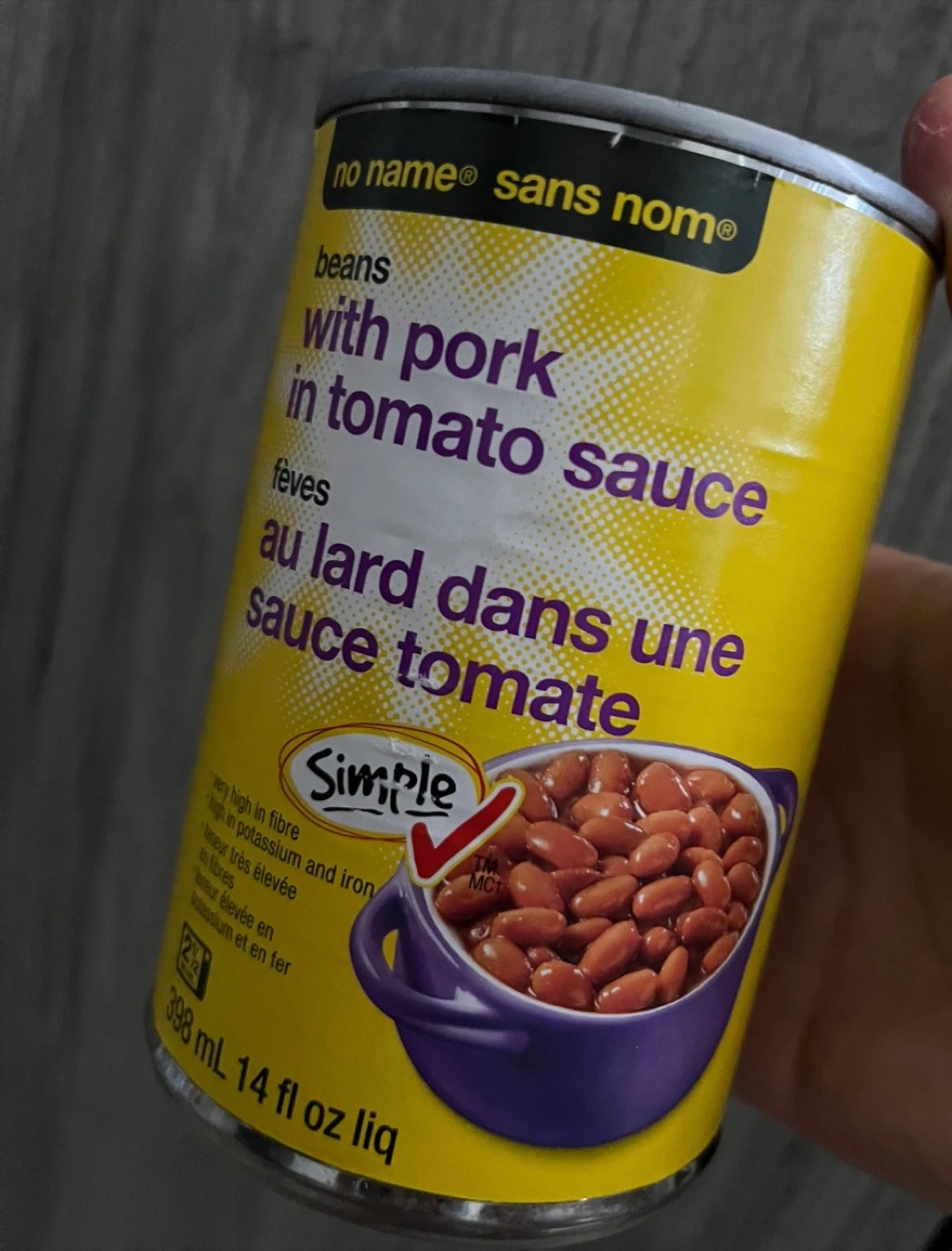 Selling a can of No Name beans with pork in tomato sauce. It's a simple and tasty meal option. The can contains 398 mL / 14 fl oz of beans. Very high in fibre, potassium and iron