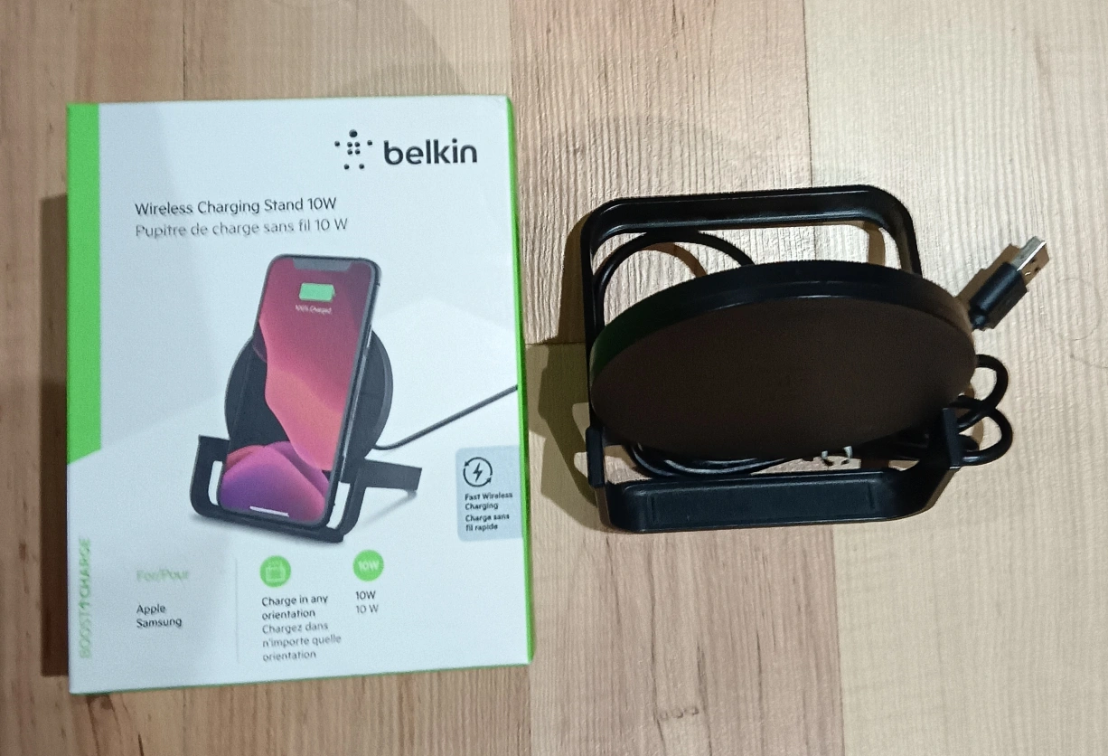 Selling a Belkin wireless charging stand! It's a 10W stand that works with both Apple and Samsung phones. It allows you to charge in any orientation and offers fast wireless charging. Perfect for keeping your phone charged and accessible!