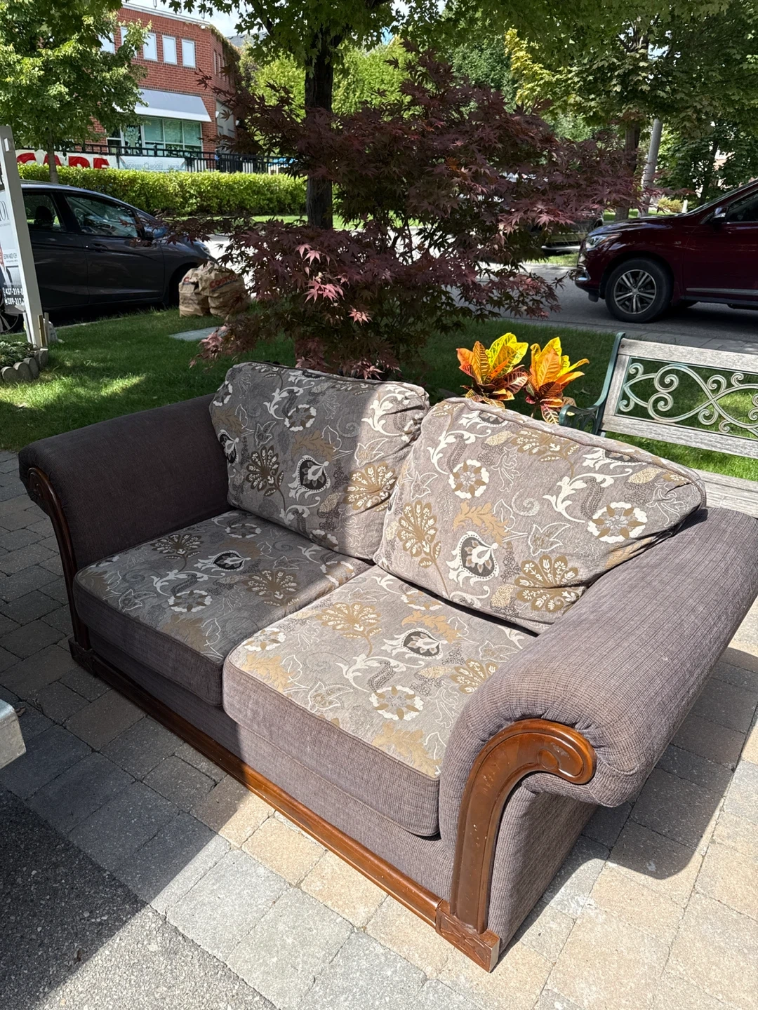 A comfortable and stylish loveseat sofa for sale! It features a brown frame with floral patterned cushions. Perfect for a living room or small space, it adds a touch of elegance to any home Pickup only