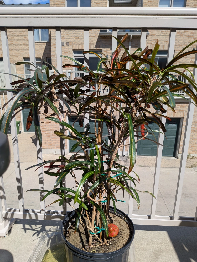 Selling a vibrant croton plant in a black pot! It's got beautiful, colourful leaves that would brighten up any space. The plant is healthy and well-cared for, ready to bring some life to your home or balcony