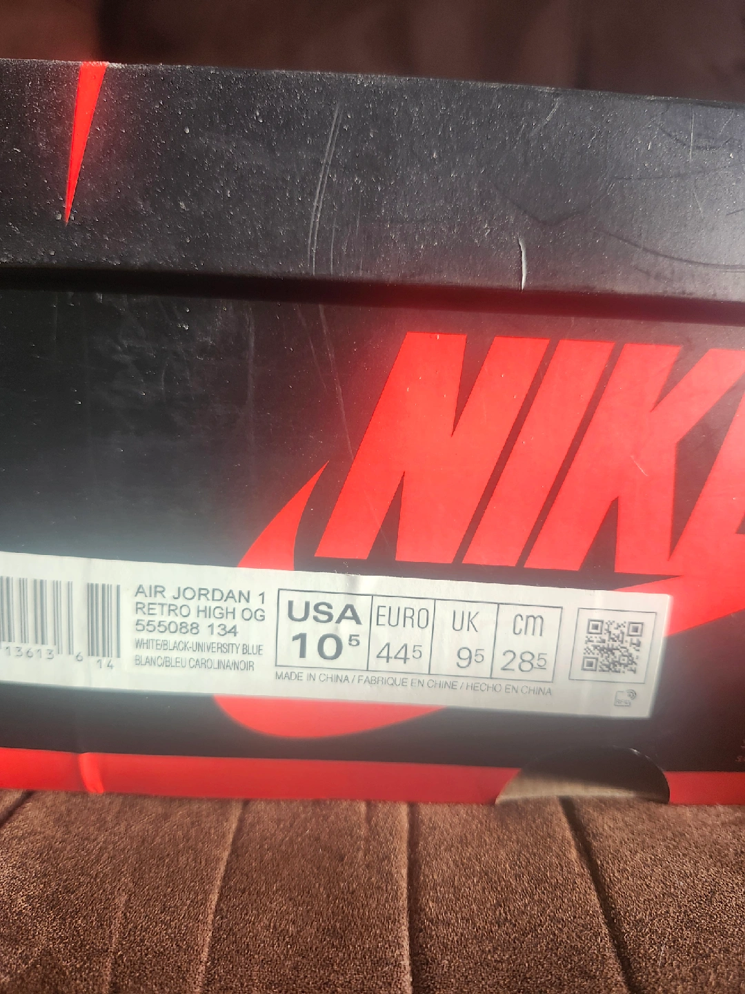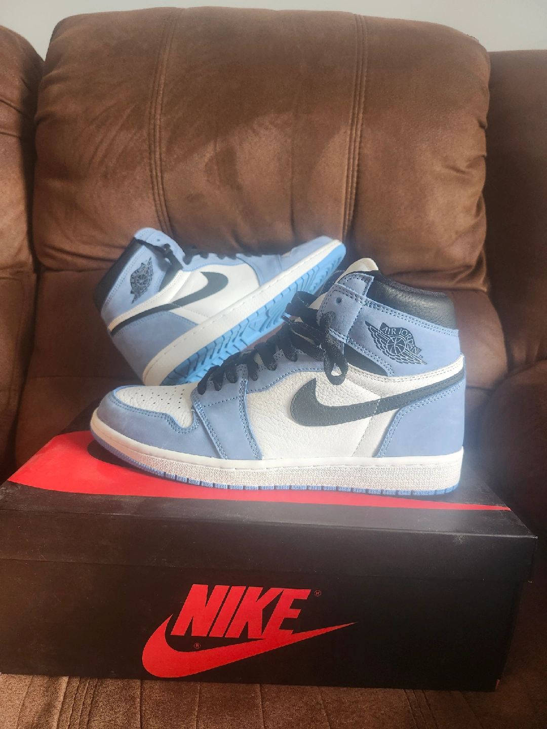 Selling a pair of Nike Air Jordan 1 Retro High OG sneakers in size 10.5 (US). The colourway is White/Black-University Blue. They're in great condition and come with the original box. A stylish addition to any sneaker collection!