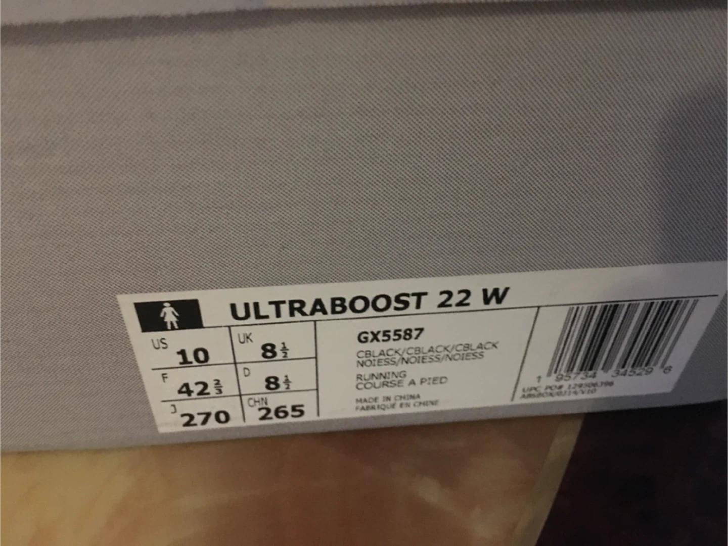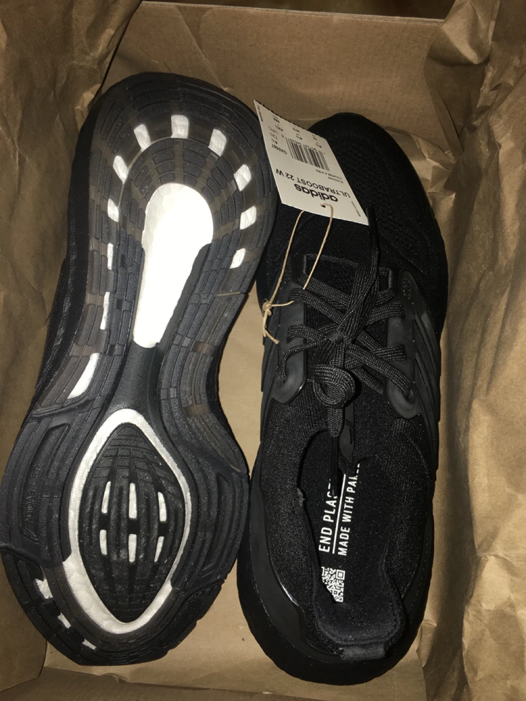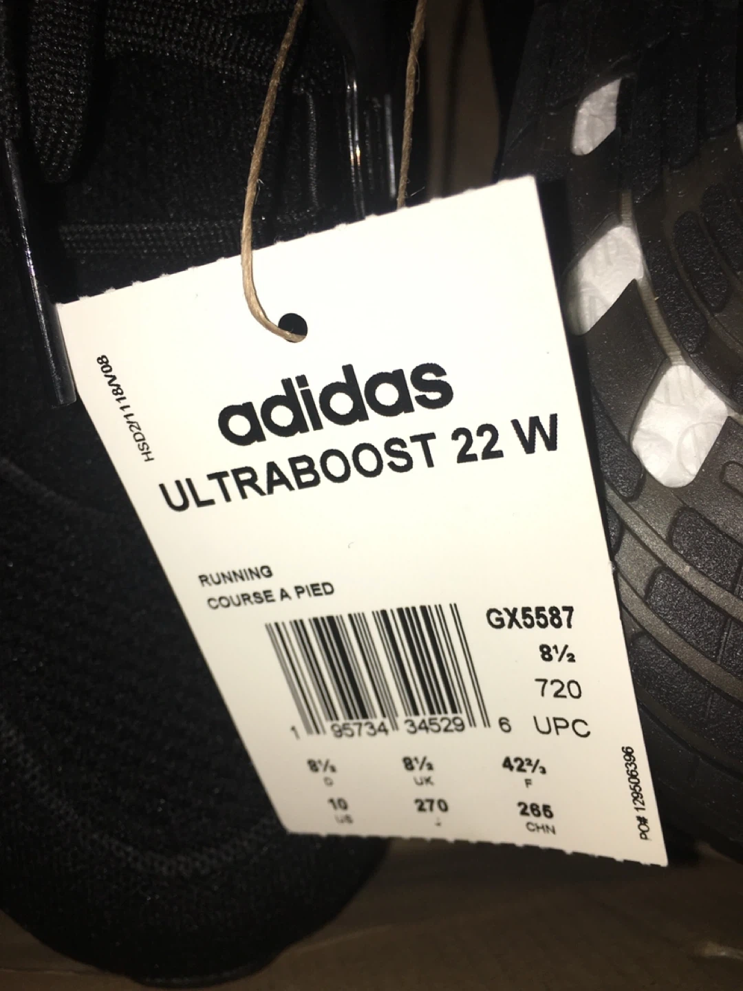 Selling a pair of Adidas Ultraboost 22 W running shoes in black. They are a women's size US 10. The model number is GX5587. Comes with the original box!