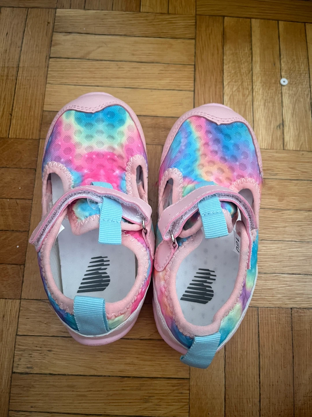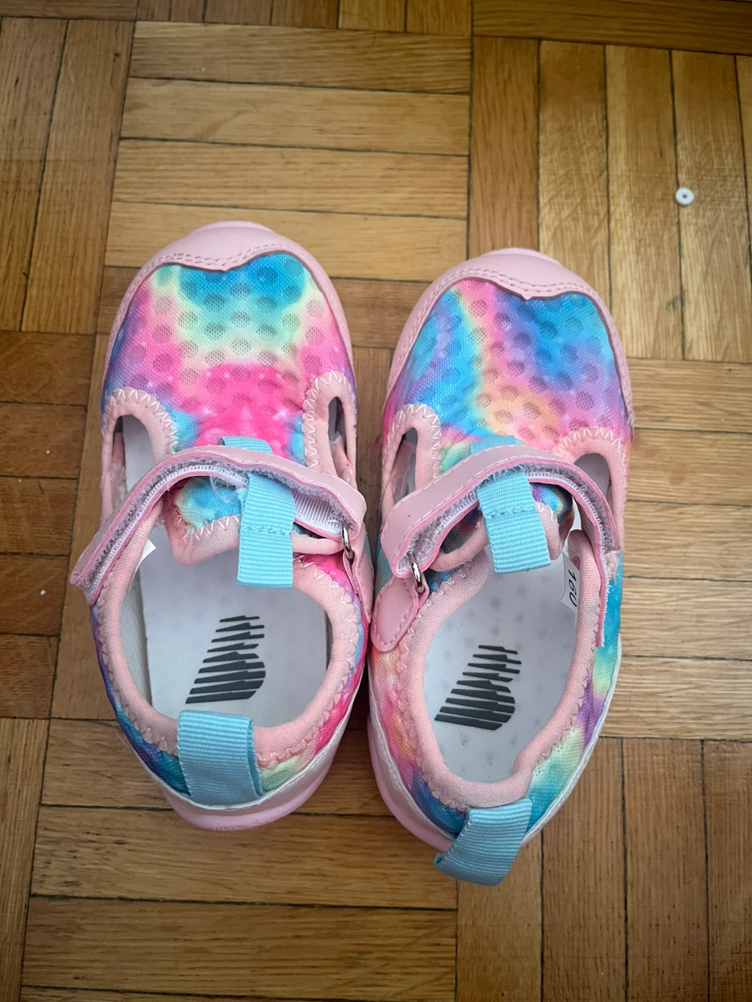 These New Balance water shoes are perfect for your little one! They're in great condition and ready for some fun in the water. The size is a US size 7. They feature a cute tie-dye pattern with pink and blue accents. Perfect for the beach or pool!