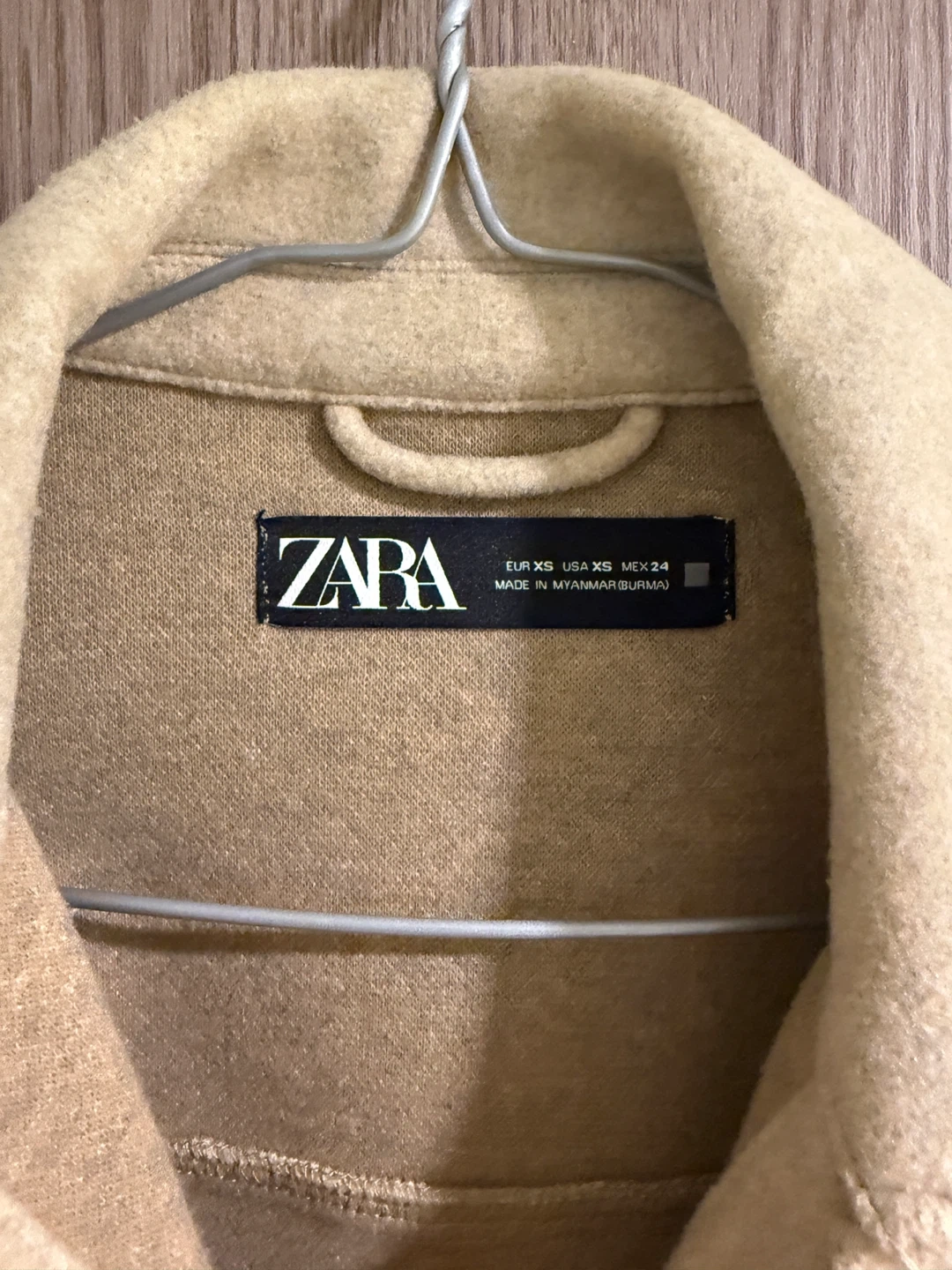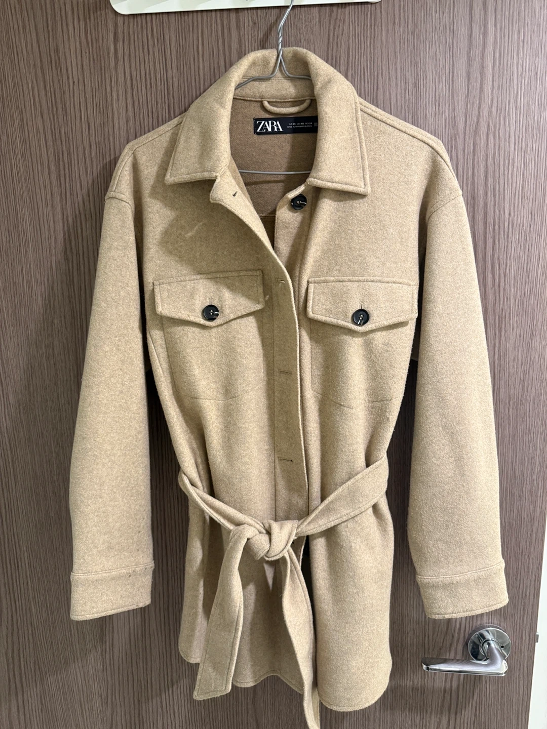Selling a Zara jacket in size XS. It's a beautiful beige colour and features a wool blend material. The jacket also comes with a belt to cinch the waist. Perfect for layering!