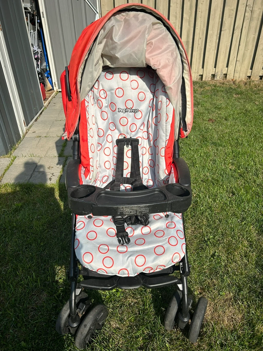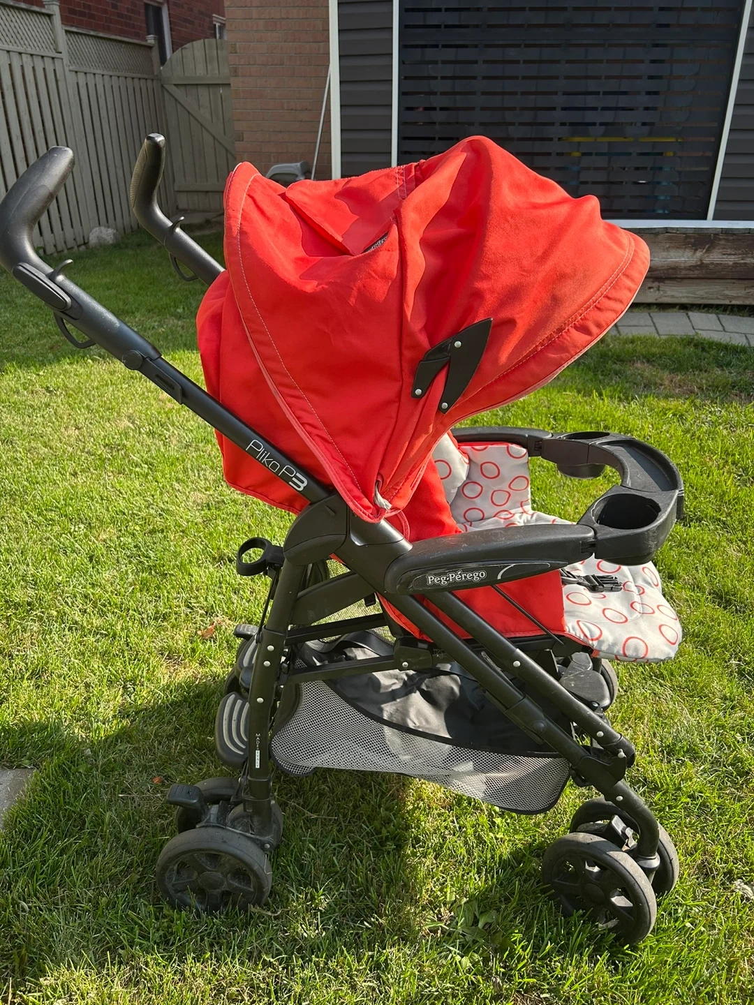 Selling a Peg Perego Piko P3 stroller in red. It's in good condition and ready for your little one's adventures! Features a convenient cup holder and storage basket underneath