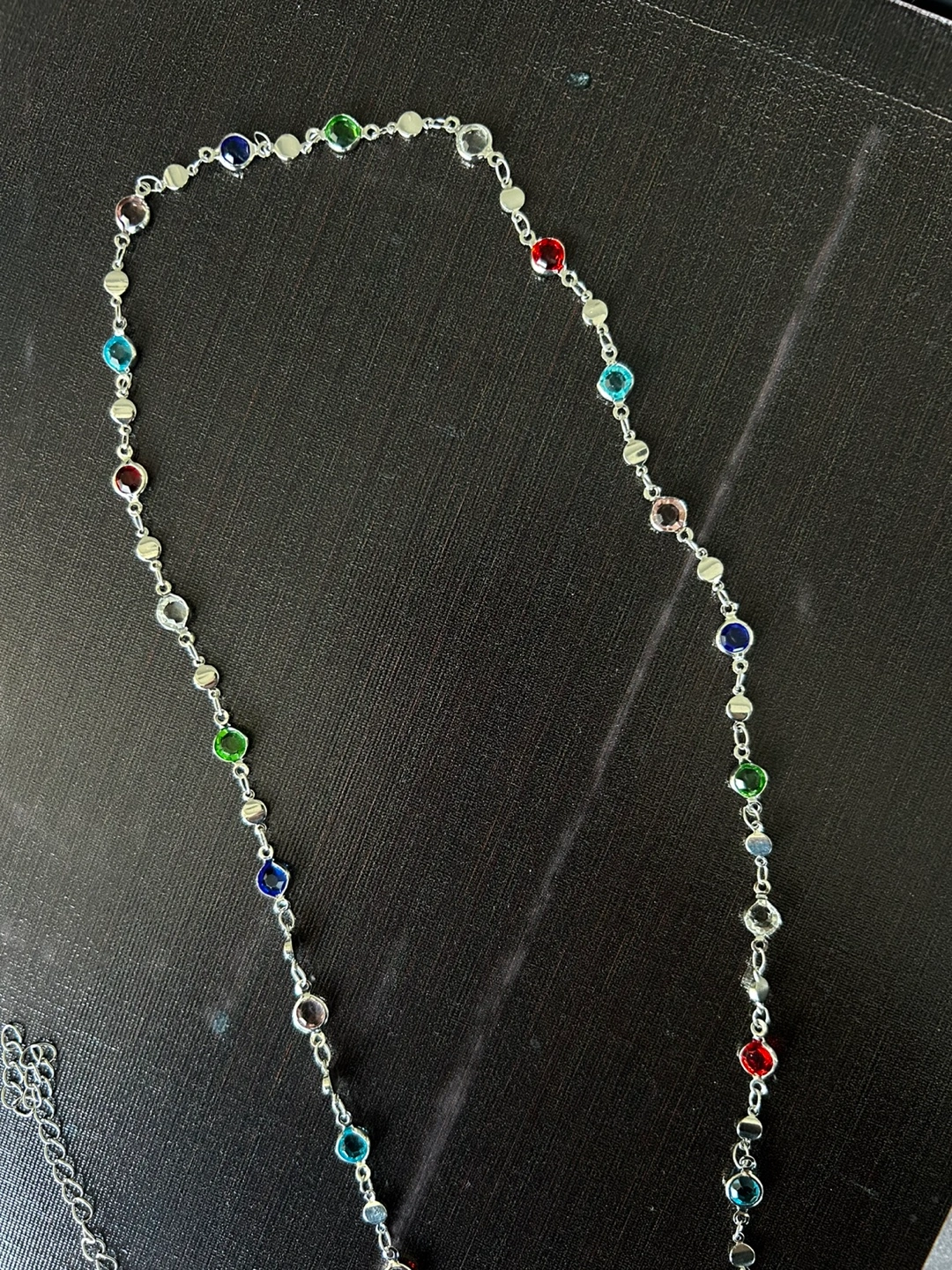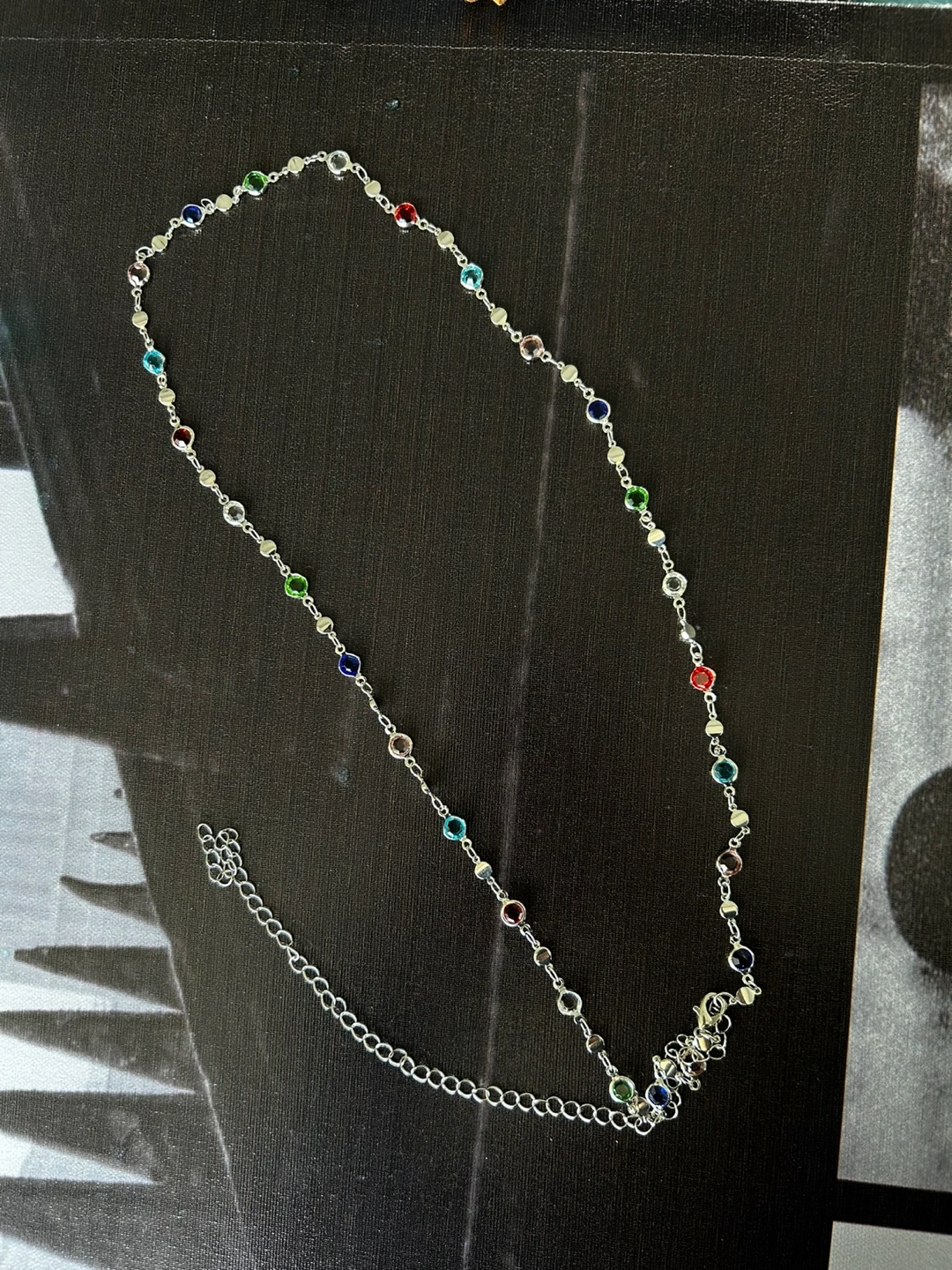 A new belly chain with a silver chain and small, round, multicolored stones. ready to add a pop of colour to any outfit! tarnish free does not change color