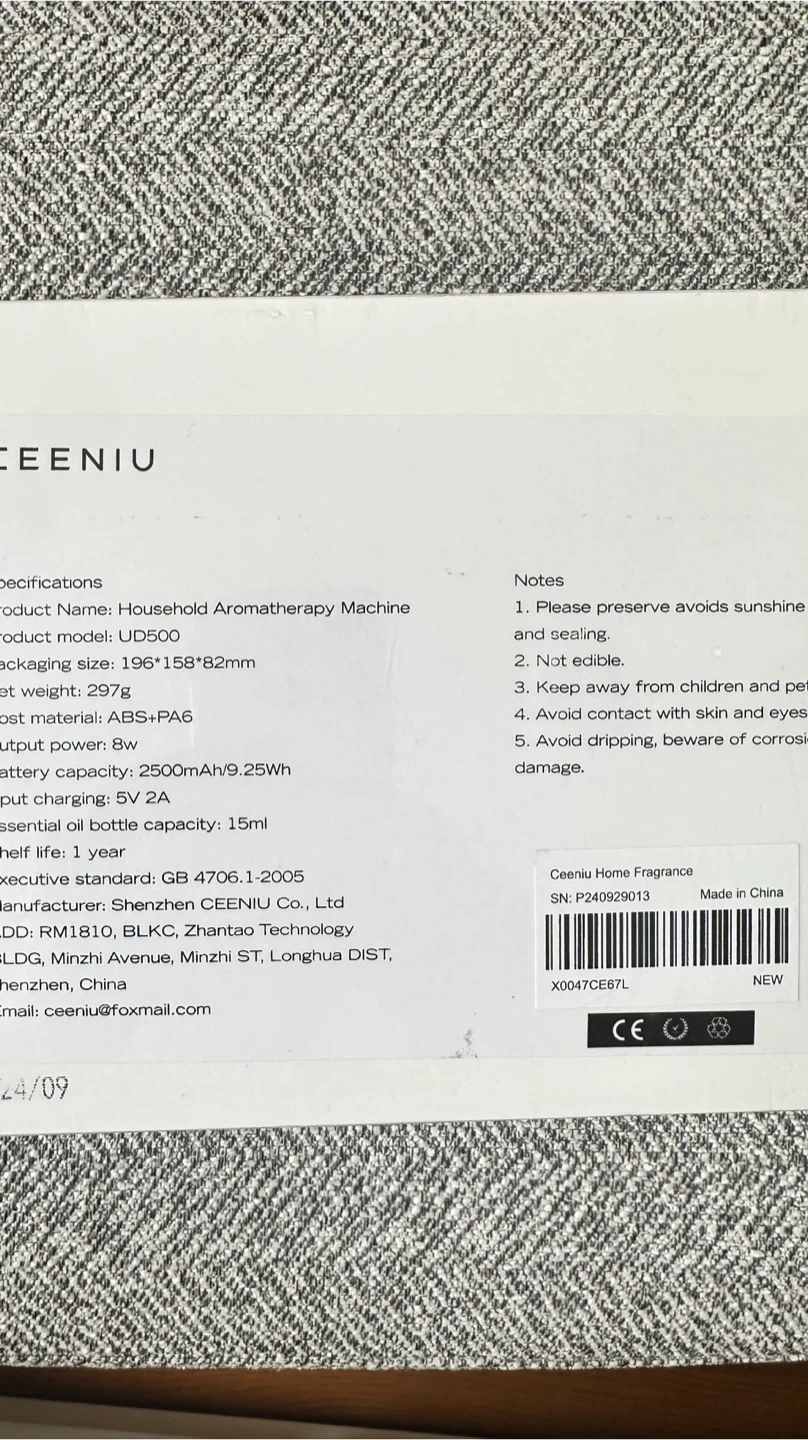 Selling a Ceeniu Household Aromatherapy Machine, model UD500. It's a great aroma diffuser to keep your home smelling fresh! Key features: - Dimensions: 196*158*82mm - Net weight: 267g - Material: ABS+PA6 - Essential oil bottle capacity: 15ml New